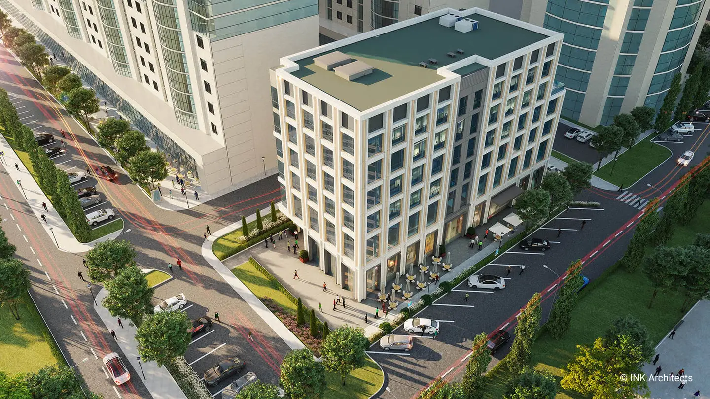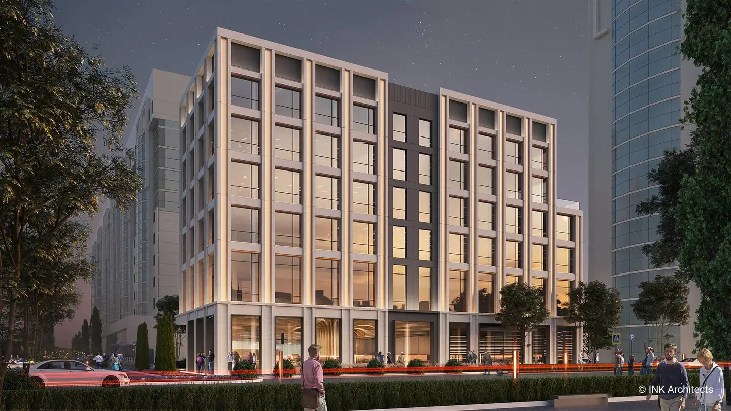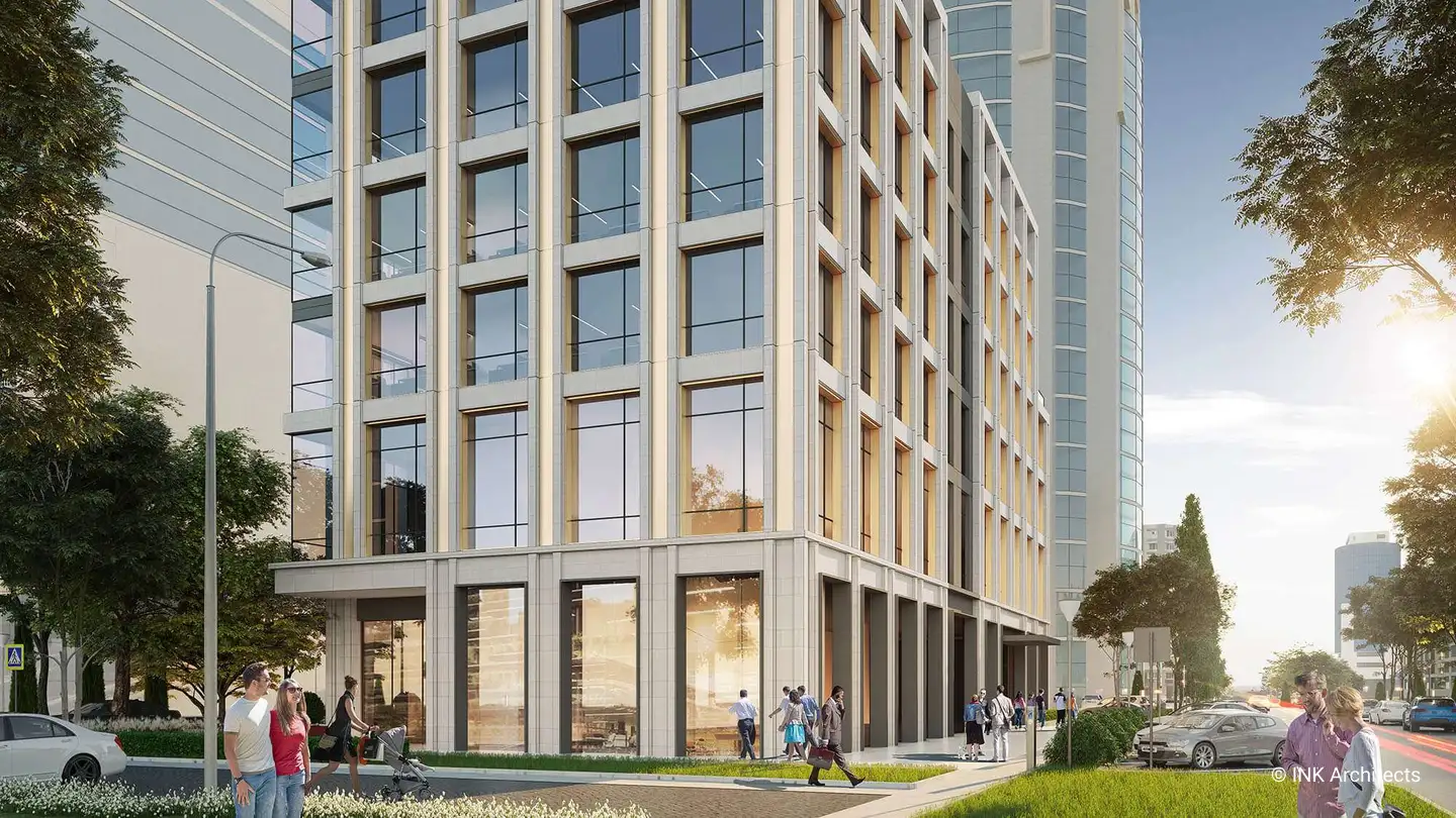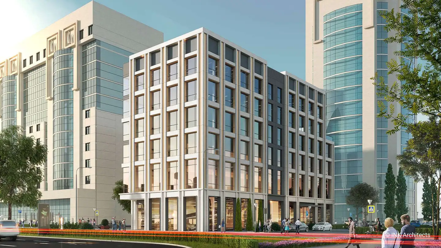 Lazurnyi business center, located at the prominent area of the city, compliments the architectural style formed along Sarayshyk Street. The distinctive character of the office building is created with golden panels giving the sophisticated and dynamic look to the facade.