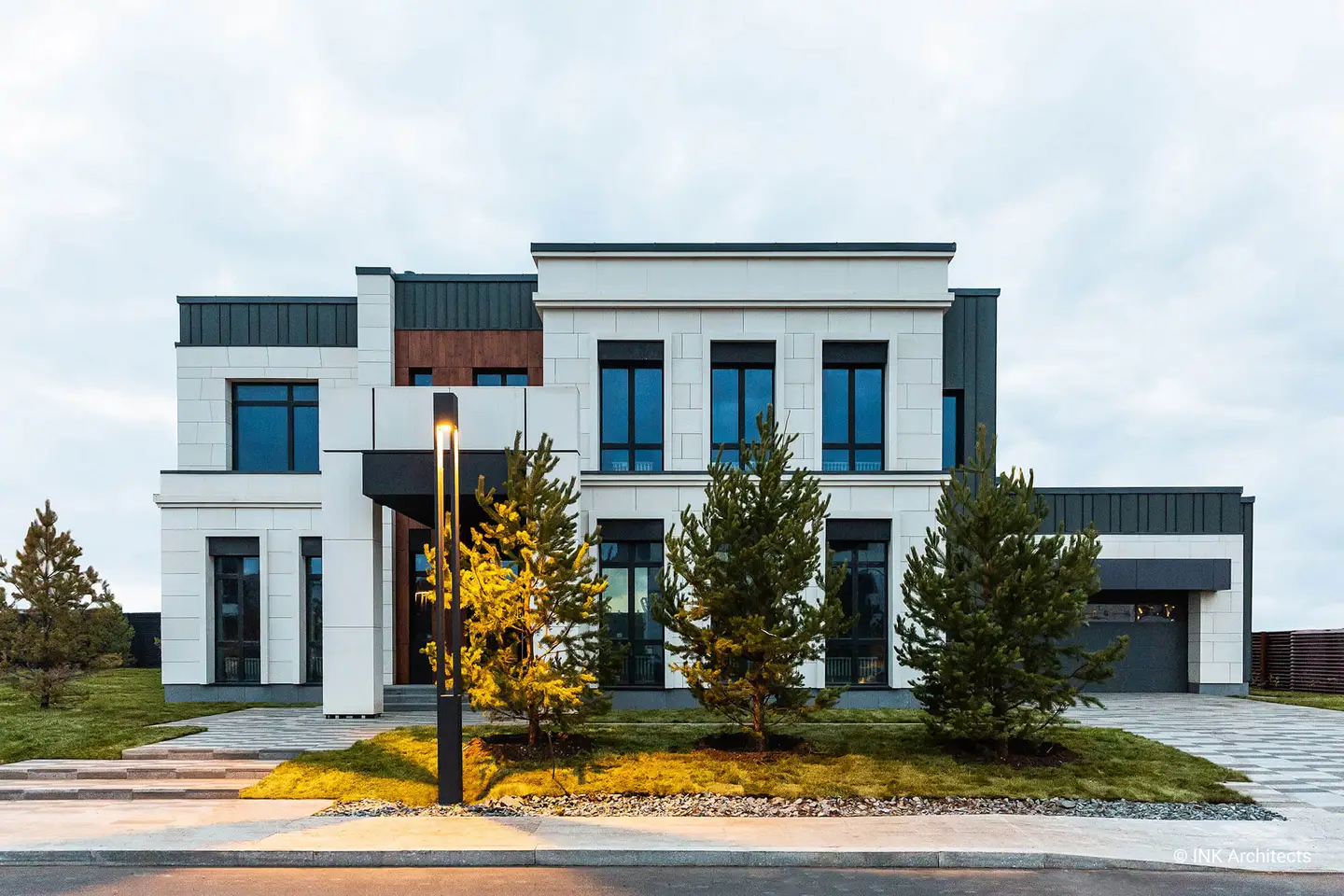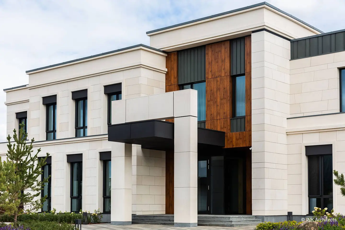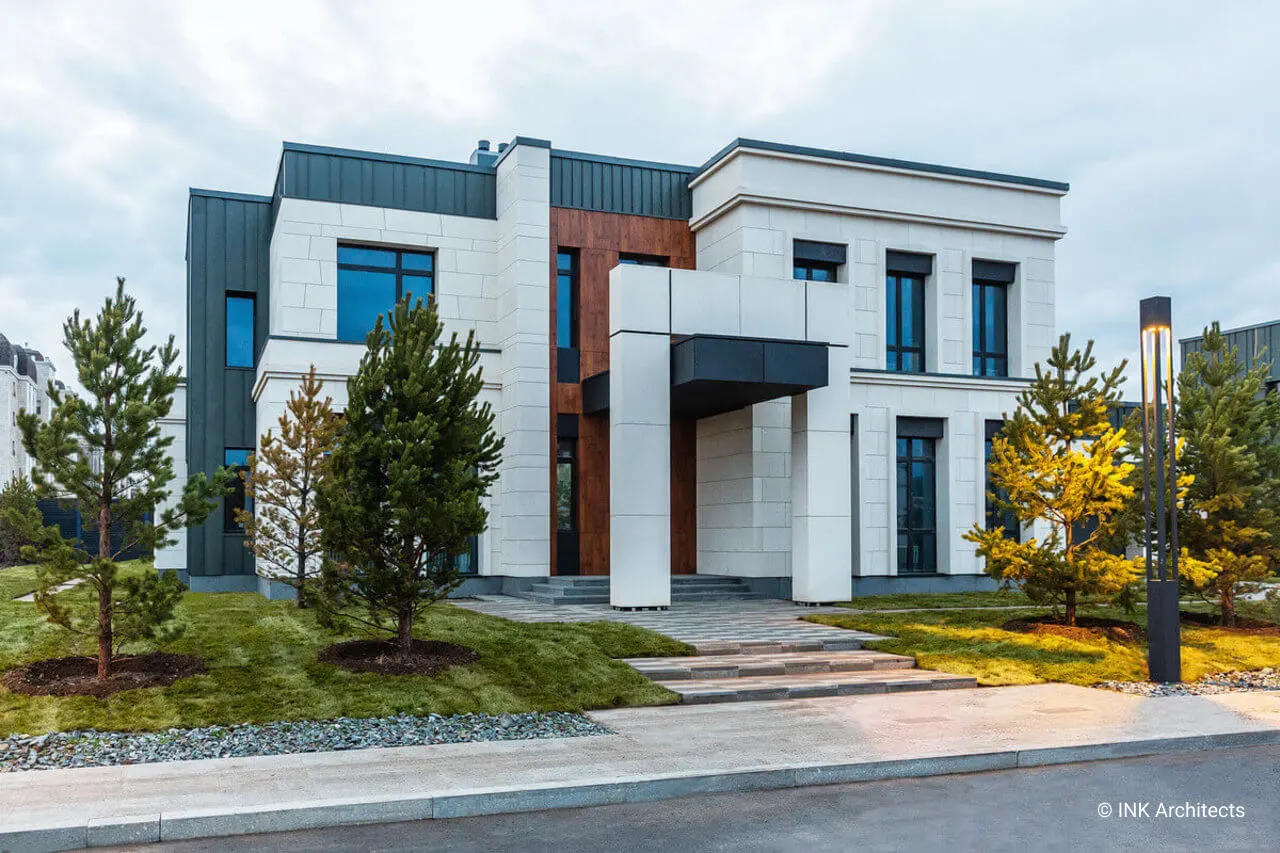 The architectural composition of the complex is an image of refined elegance and laconic simplicity. Created in the best traditions of modern classics combined with accents of modern elements, the strict linear exteriors of White Hills are made of light stone, metal and wooden panel inserts. This combination of materials gives the monumental and strict facades both architectural dynamics and the look of a homely atmosphere.