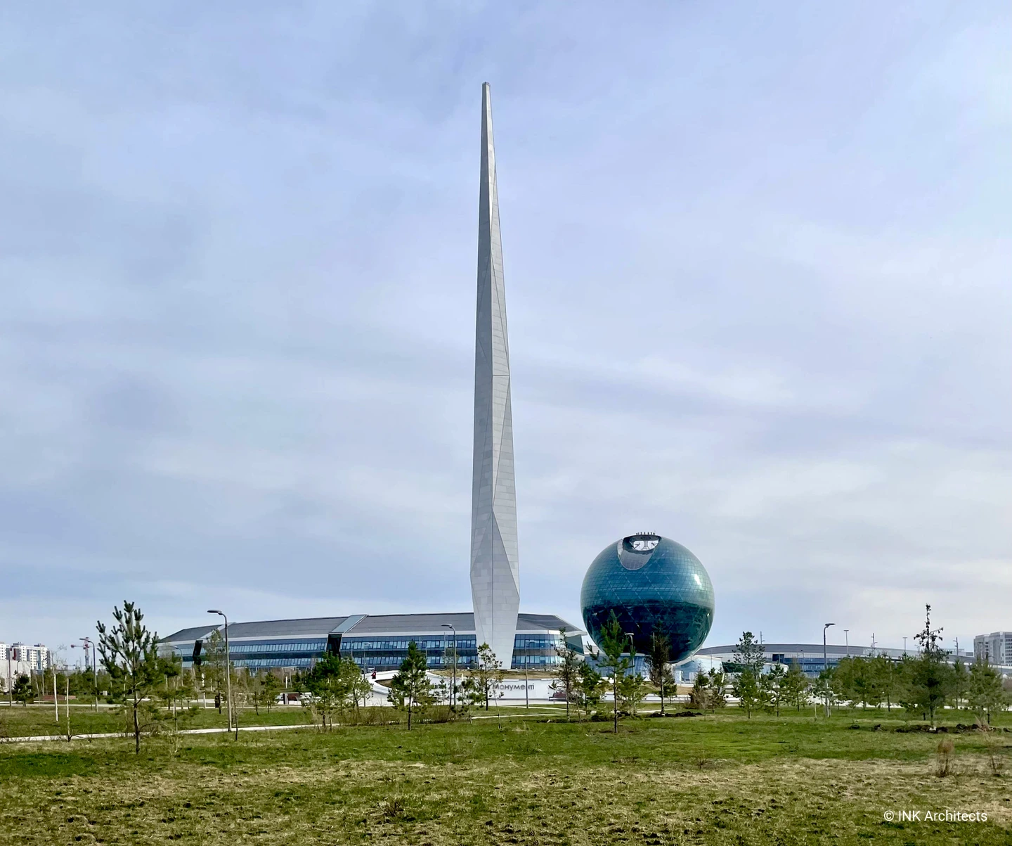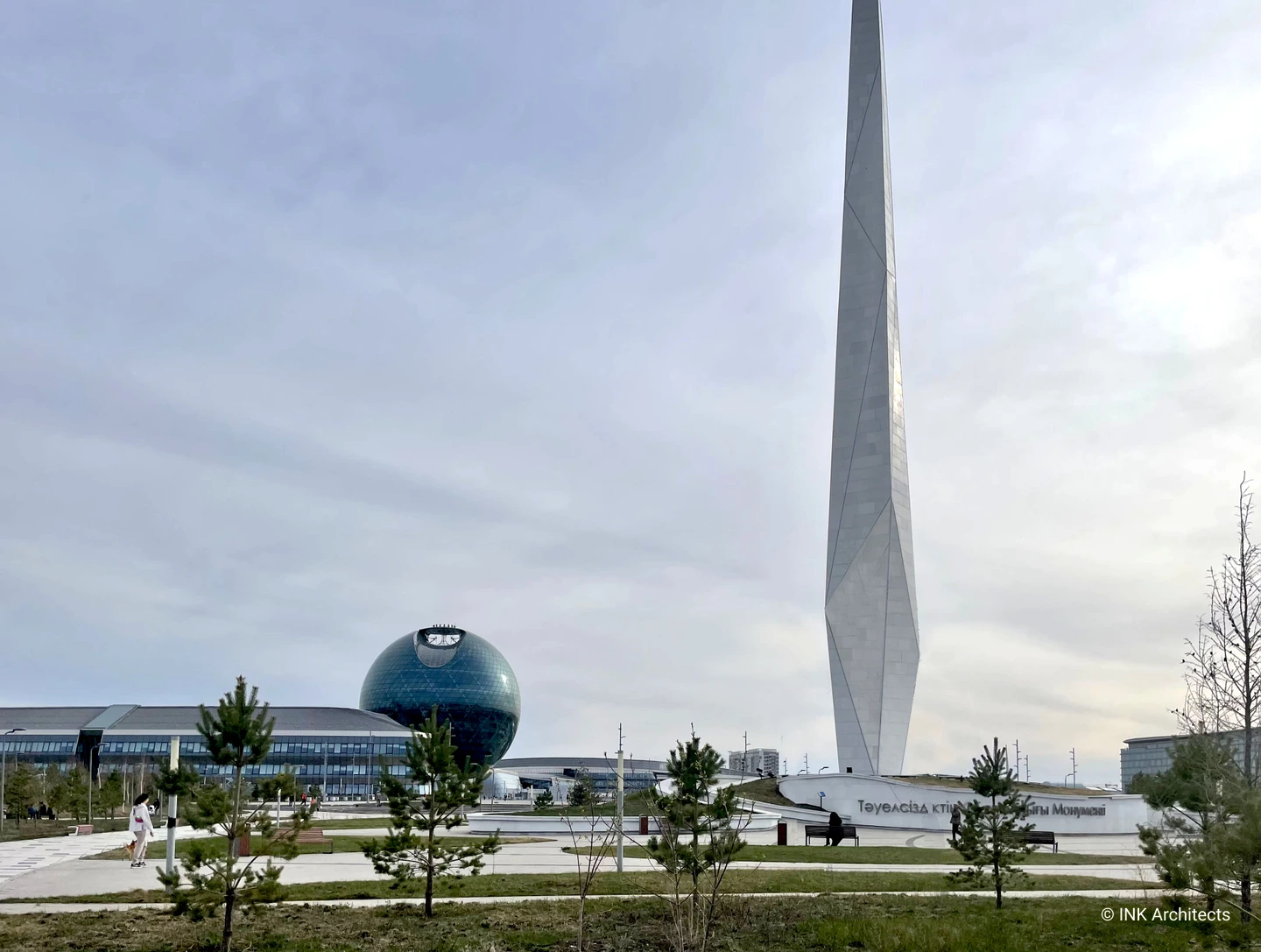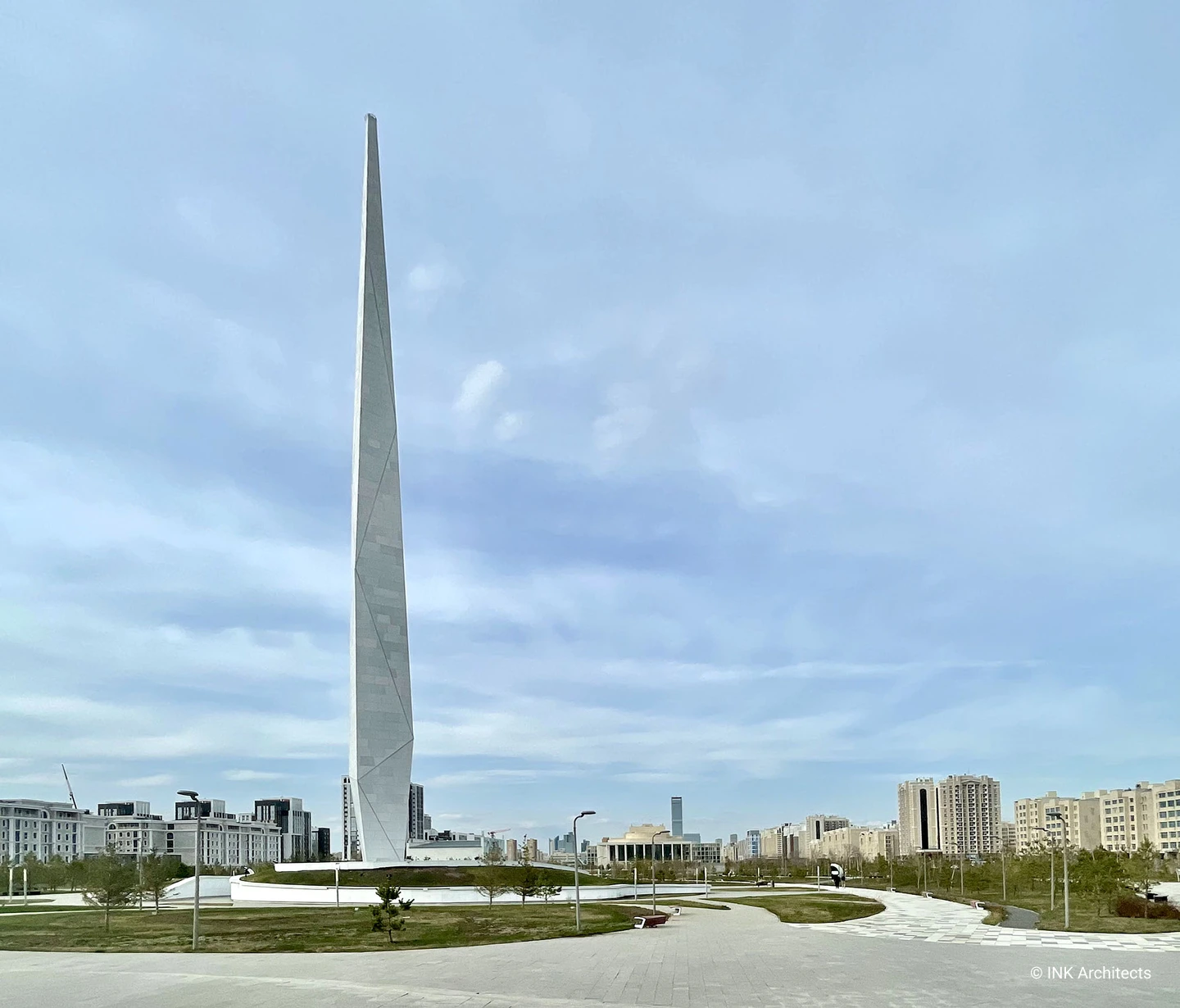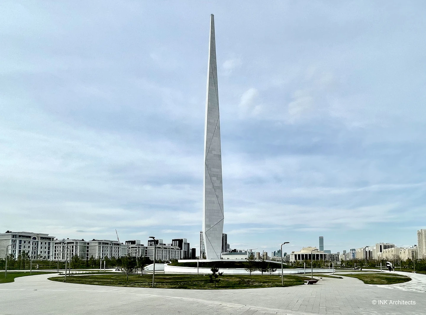 A stela directed to the sky. Made up of twenty-five faces, each symbolizes one of the key milestones and accomplishments reached by the people during the period of independence from 1991 to the present. The architectural image is dictated by the deep traditions preserved in the popular consciousness (Tengri - the nomadic universe, the cosmos, used by the people to orient themselves in space, organize their lives, and to which they addressed their prayers). At the same time, the architectural composition is aimed at presenting the ultimate symbolic expression of one of modernity’s main ideas: the idea of a common home for all the peoples of the Great Steppe. The stylistic design uses a universal form, international in essence - the strict geometric vertical. The monument, with its orientation toward the sky, marks our best aspirations and spiritual impulses. The future of the whole world - this is the pinnacle of creative spirit.