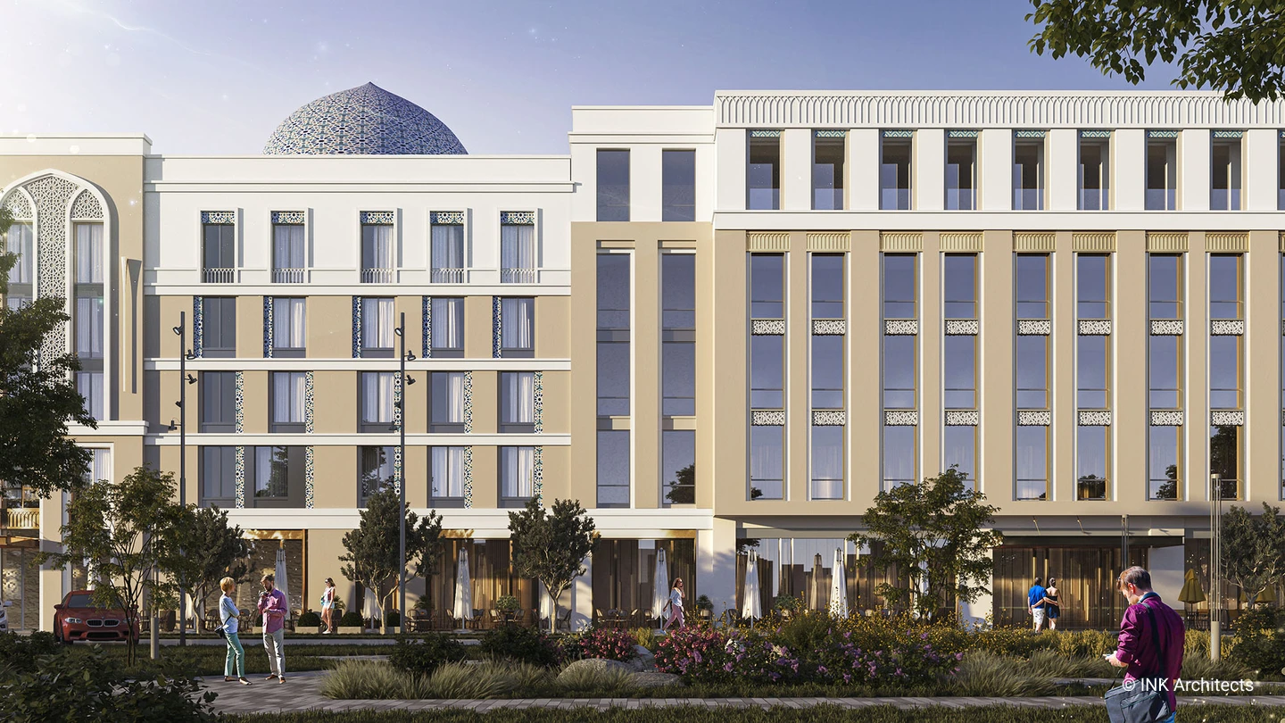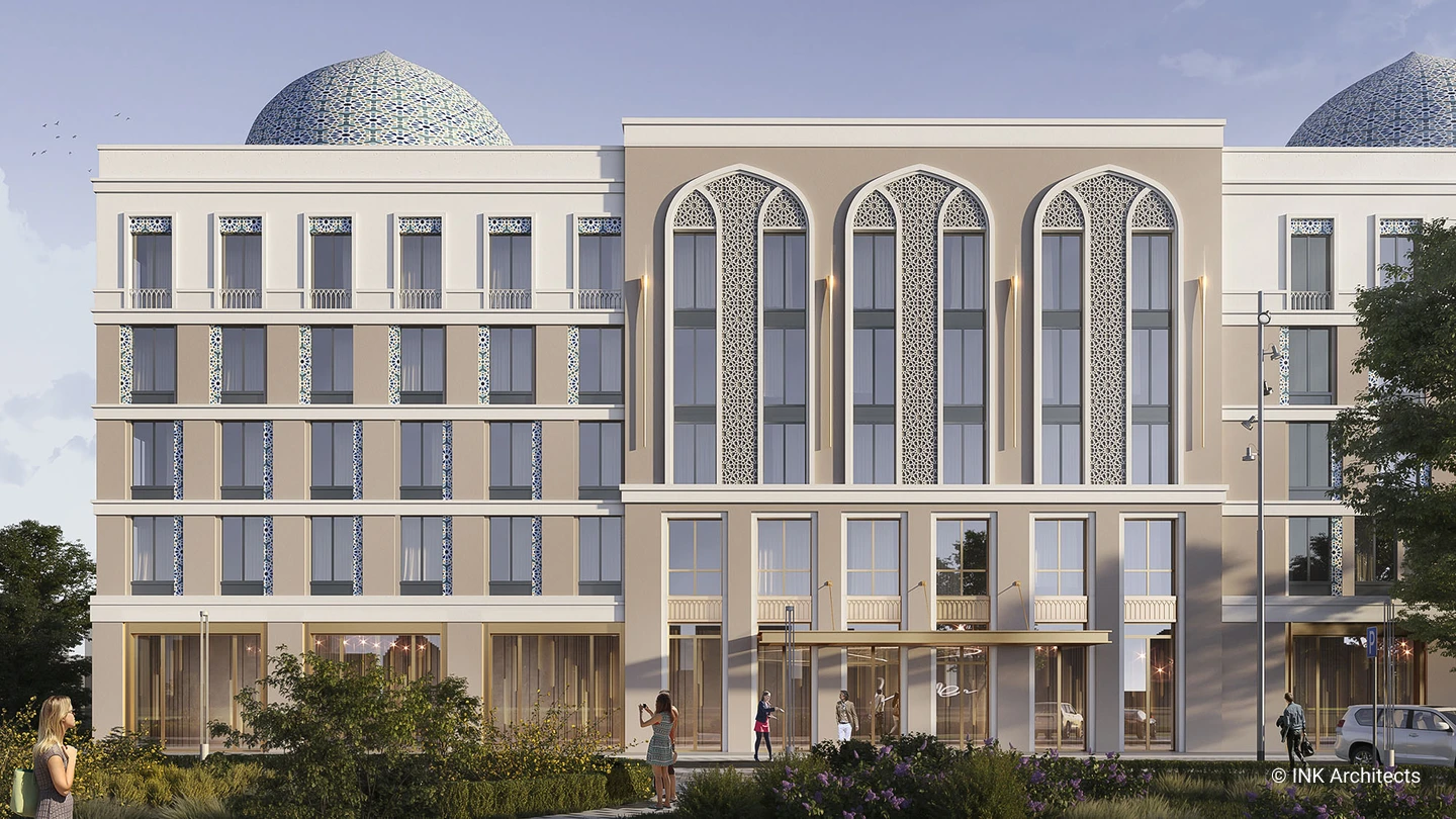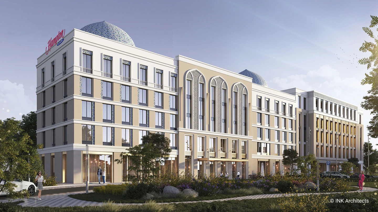 One of the design aspirations for Hampton by Hilton in Tashkent is integrating Uzbek national patterns to create recognizable facades and reflect the area's history. Materiality is the key to architectural expression. For instance, the golden palette assembles the feel of luxury.