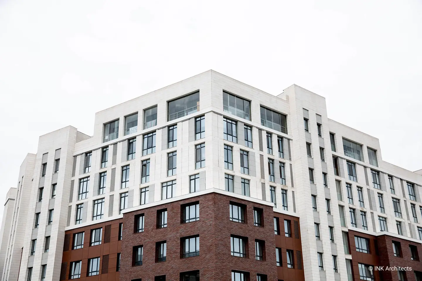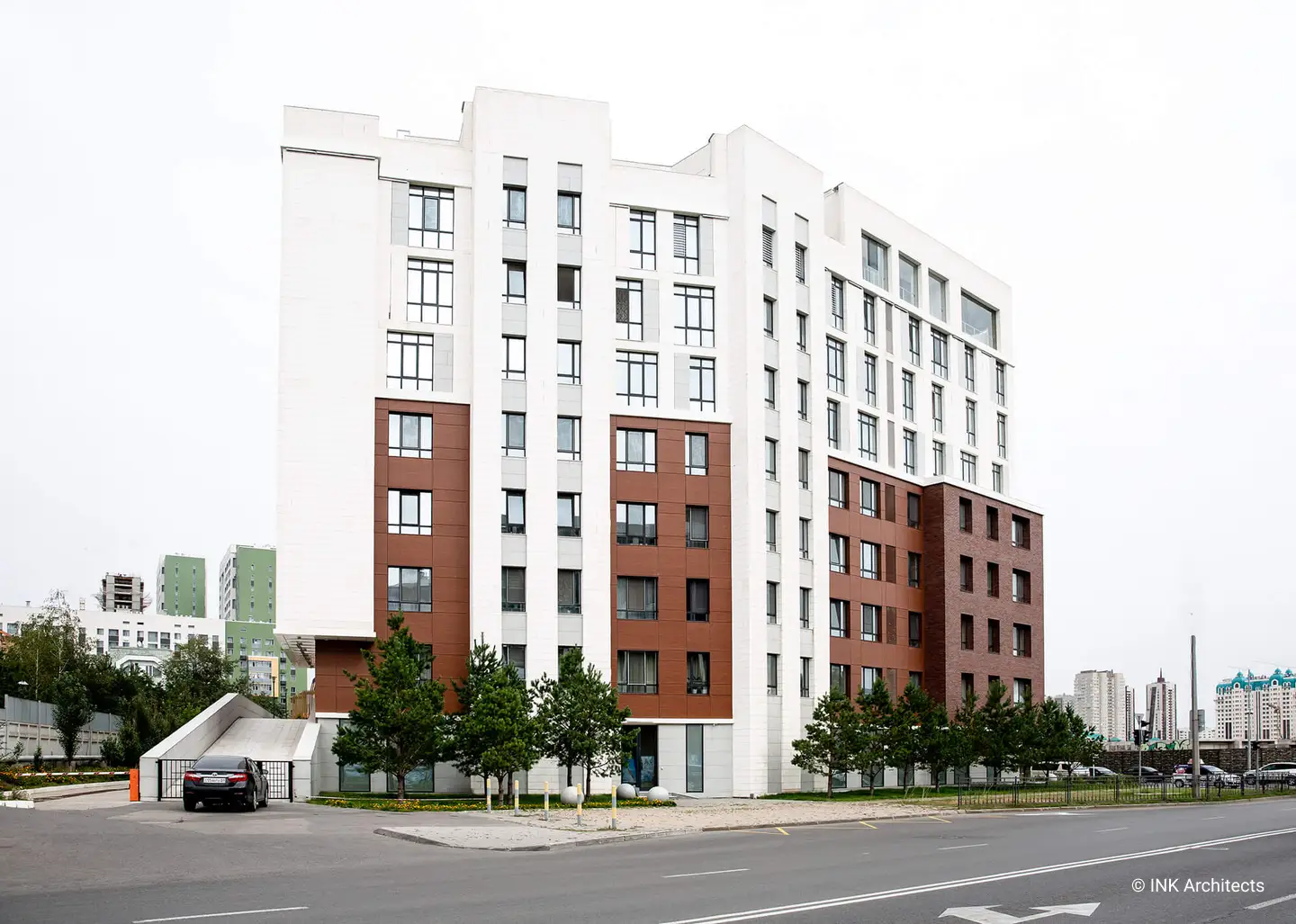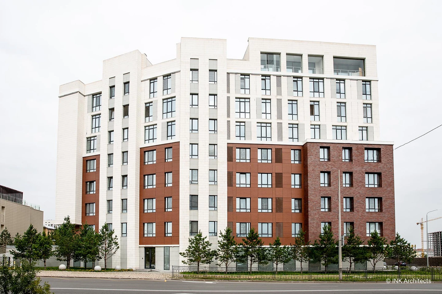 The AkBulak Hills building presents a modern interpretation of functionalism. The structure’s facades are divided by pilaster features, the horizontal belts of the cornices, the bay windows on the lateral ends, the texture of the finishing material, the play of shapes of the window openings. A balanced composition is created by all the geometric vertical and horizontal rhythms of the divisions in the facade, the color accents, and a combination of different window shapes.