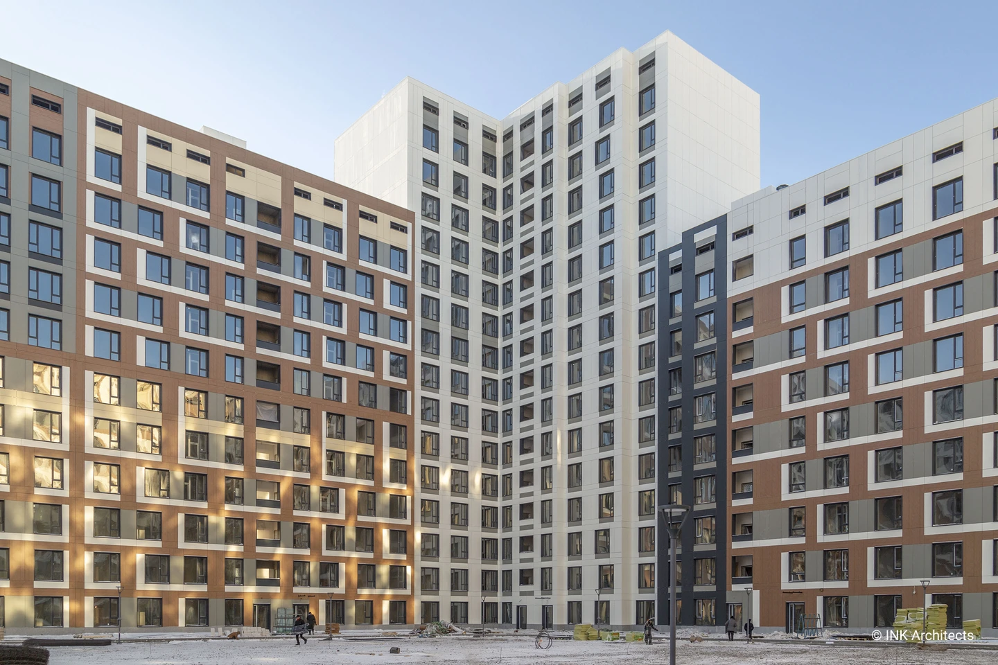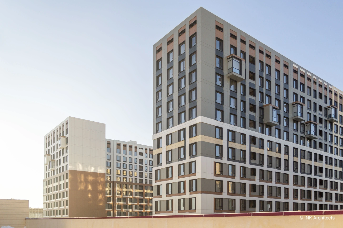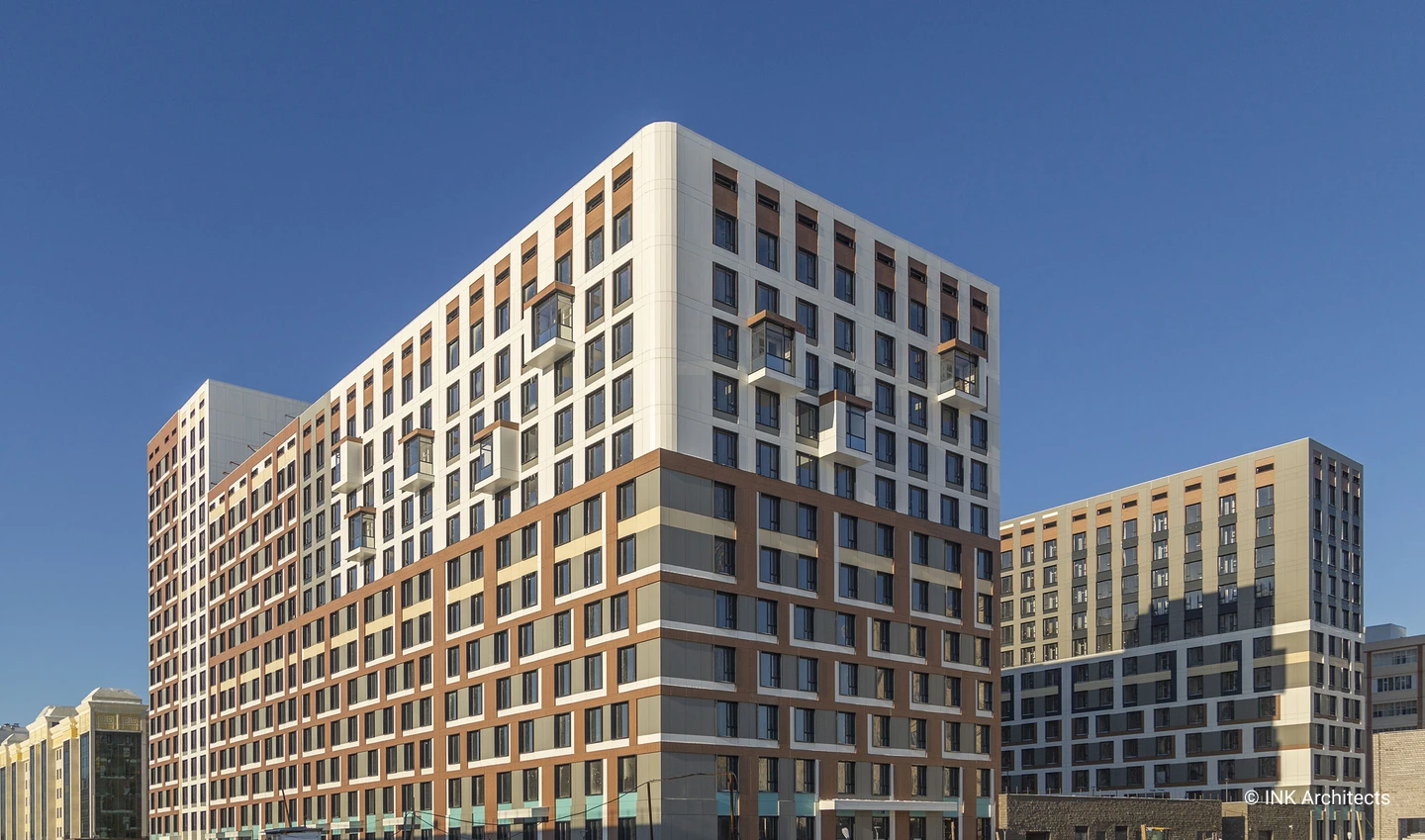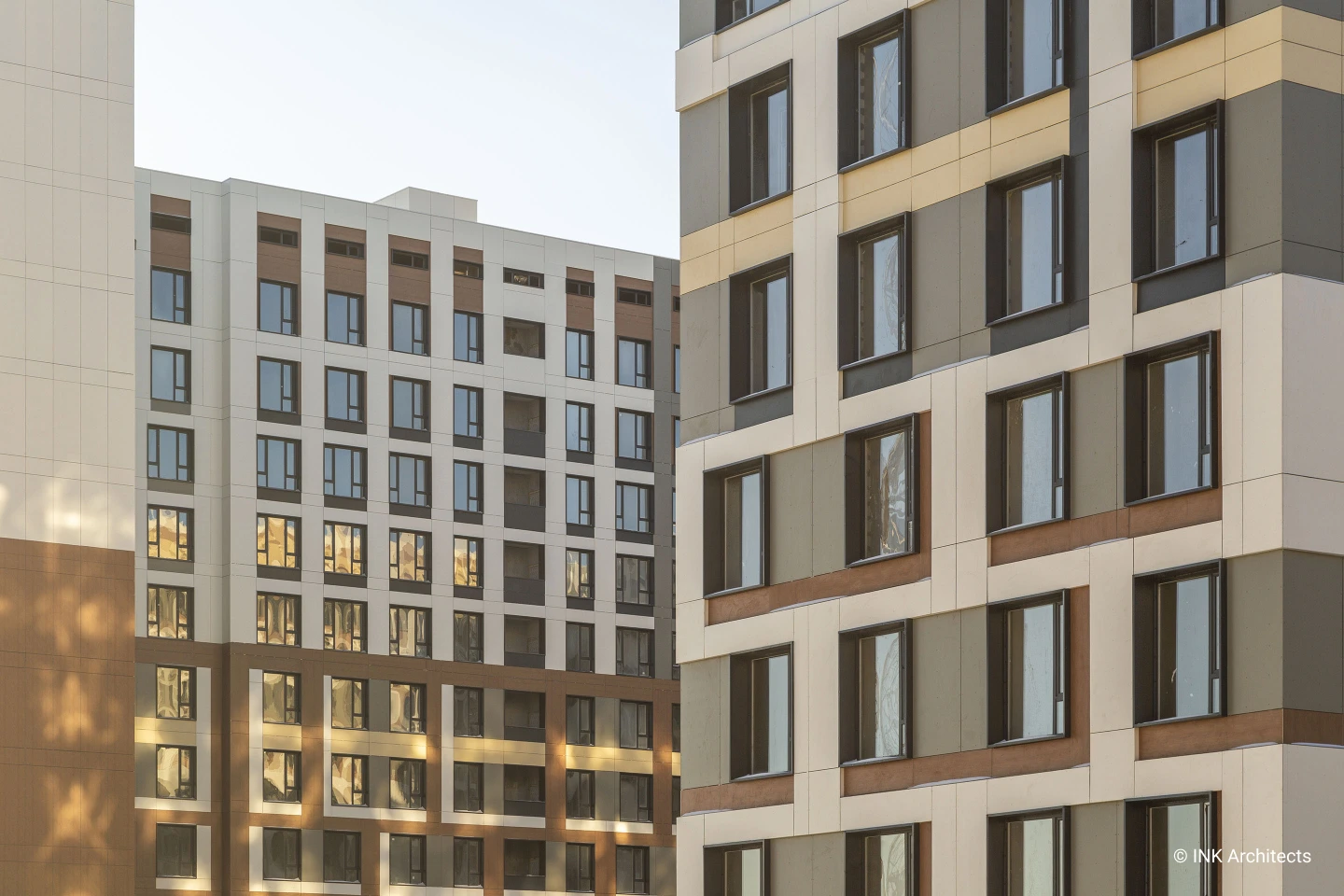 The artistic solution of the architecture employs the concise simplicity of neoplasticism aesthetics. A strict linear graphic is created by an asymmetrical "lining" of the entire perimeter of the facades of the houses with cladding panels in white, gray, and ochre tones. The overall composition is accentuated only by a few fully glazed, cantilevered "screens" of balconies against the background of flat walls.