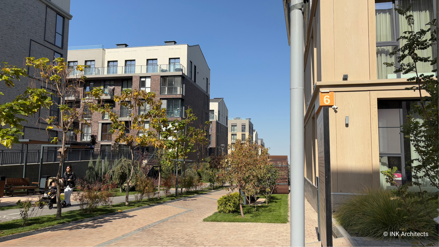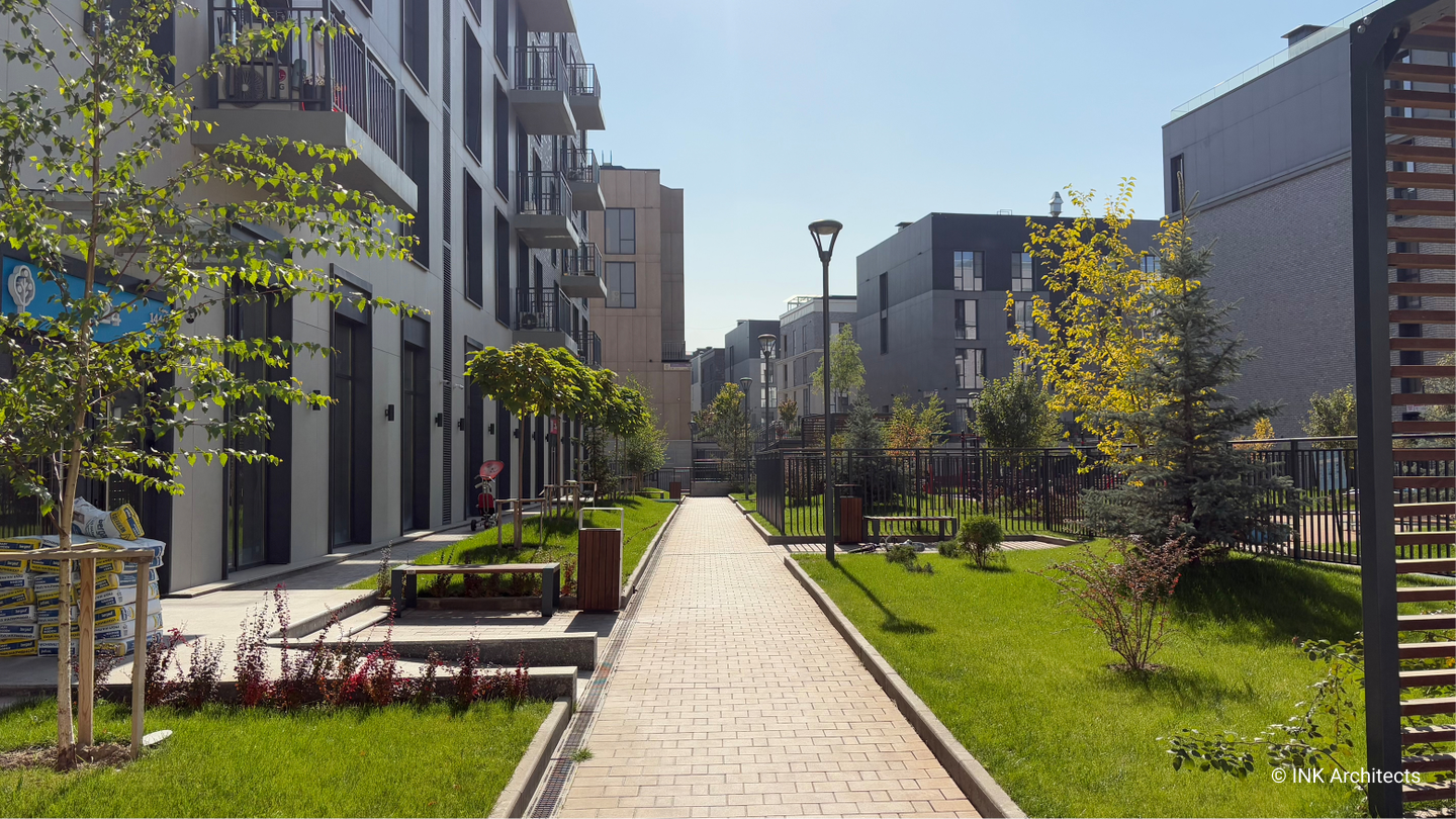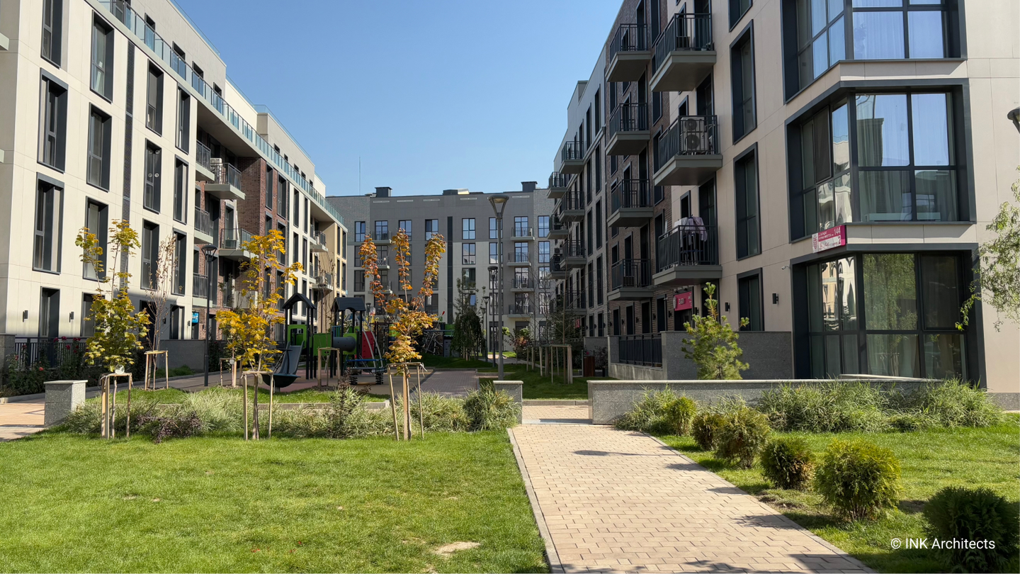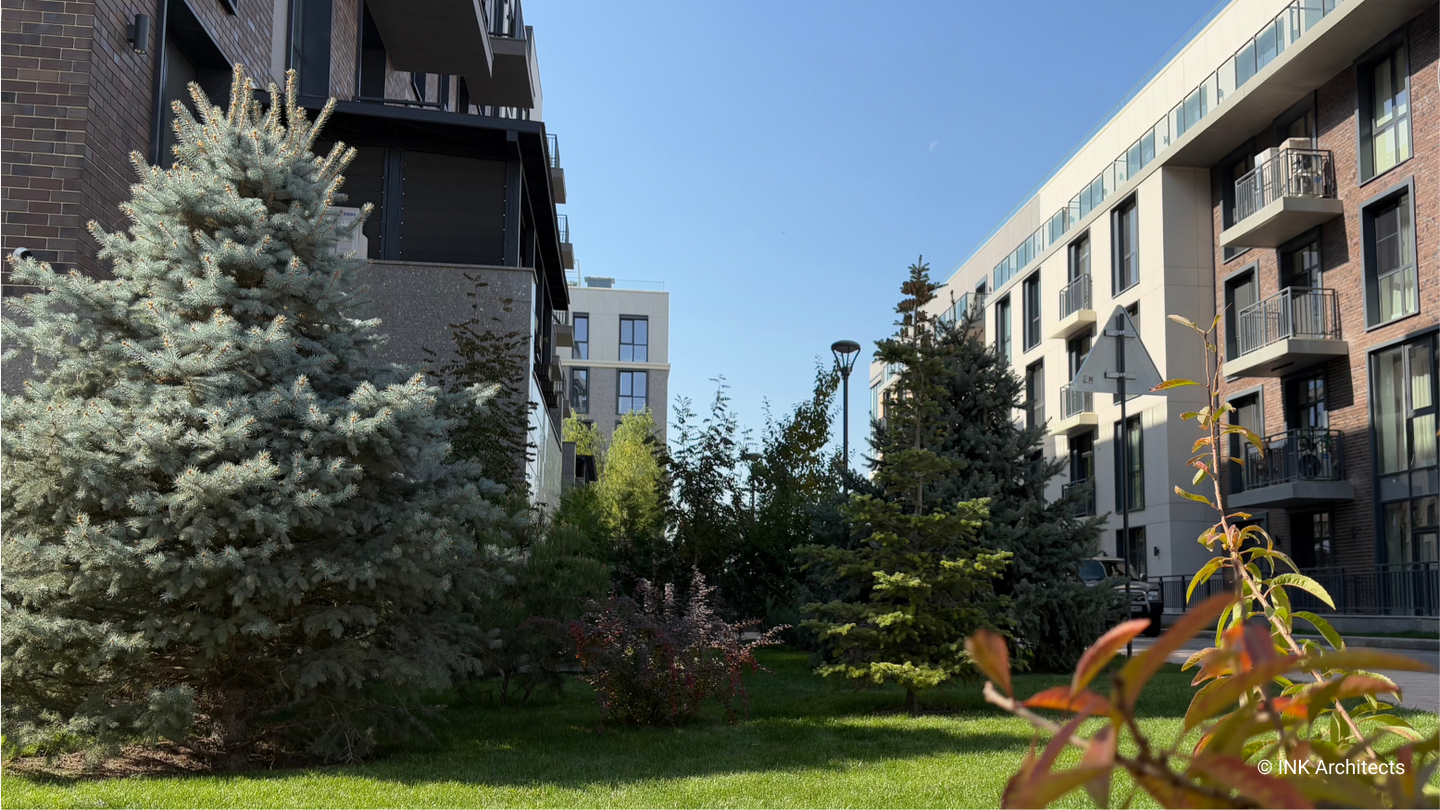 The residents will benefit from 2-4 story buildings, living in a compact and dense neighborhood that boosts the sense of community and overall well-being. The architecture of the complex merges neo-classic and modern architecture styles, featuring facades and building materials that differ from house to house to create visual diversity and a sense of space. The facades' finish incorporates high-quality and eco-friendly modern materials such as natural stone, clinker bricks, ventilated HPL panels, and aluminum facade panels. Vertical landscaping is also provided for creating cozy green courtyard spaces that offer a pleasant environment for the residents.