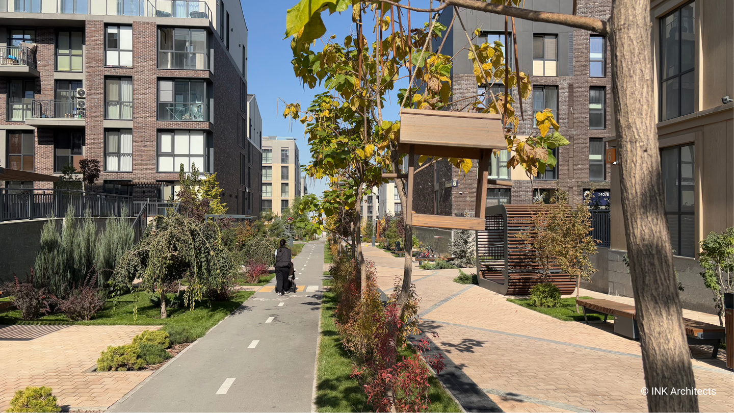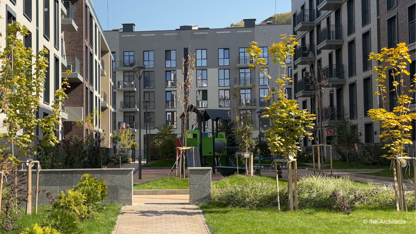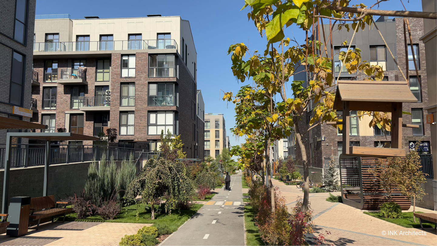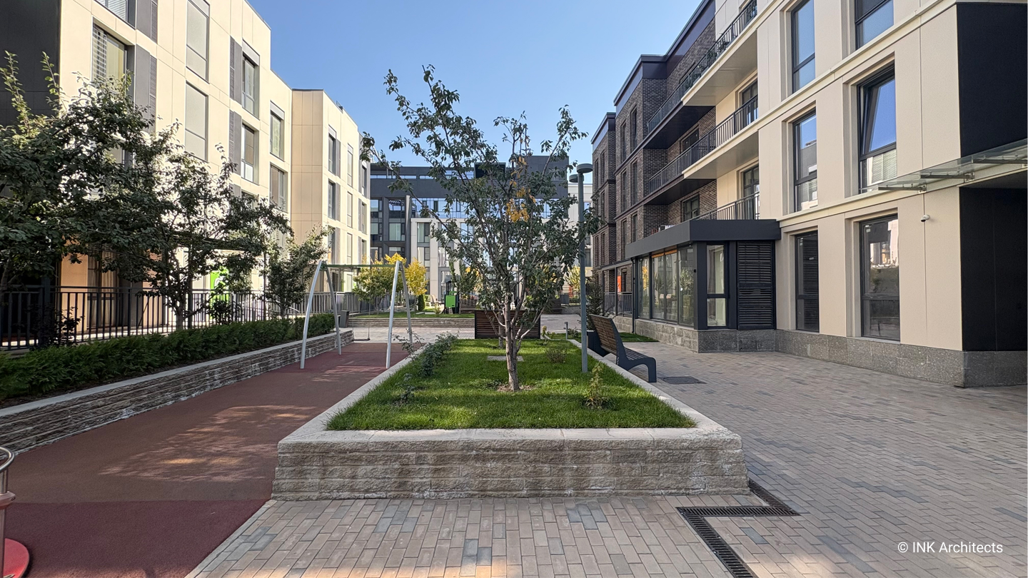The residents will benefit from 2-4 story buildings, living in a compact and dense neighborhood that boosts the sense of community and overall well-being. The architecture of the complex merges neo-classic and modern architecture styles, featuring facades and building materials that differ from house to house to create visual diversity and a sense of space. The facades' finish incorporates high-quality and eco-friendly modern materials such as natural stone, clinker bricks, ventilated HPL panels, and aluminum facade panels. Vertical landscaping is also provided for creating cozy green courtyard spaces that offer a pleasant environment for the residents.
