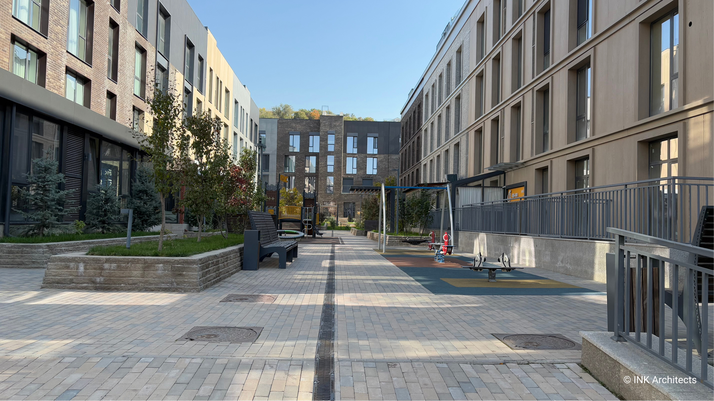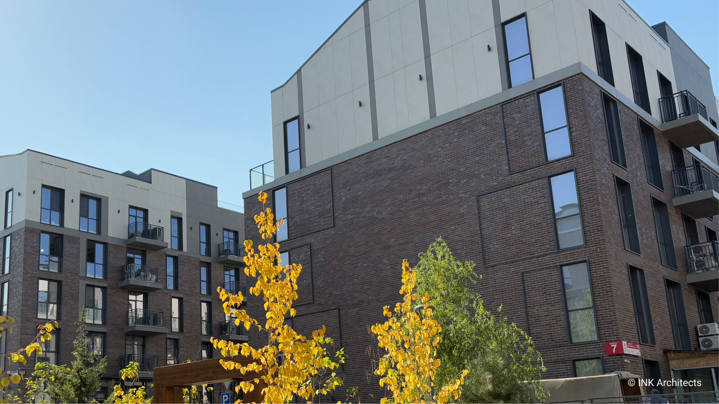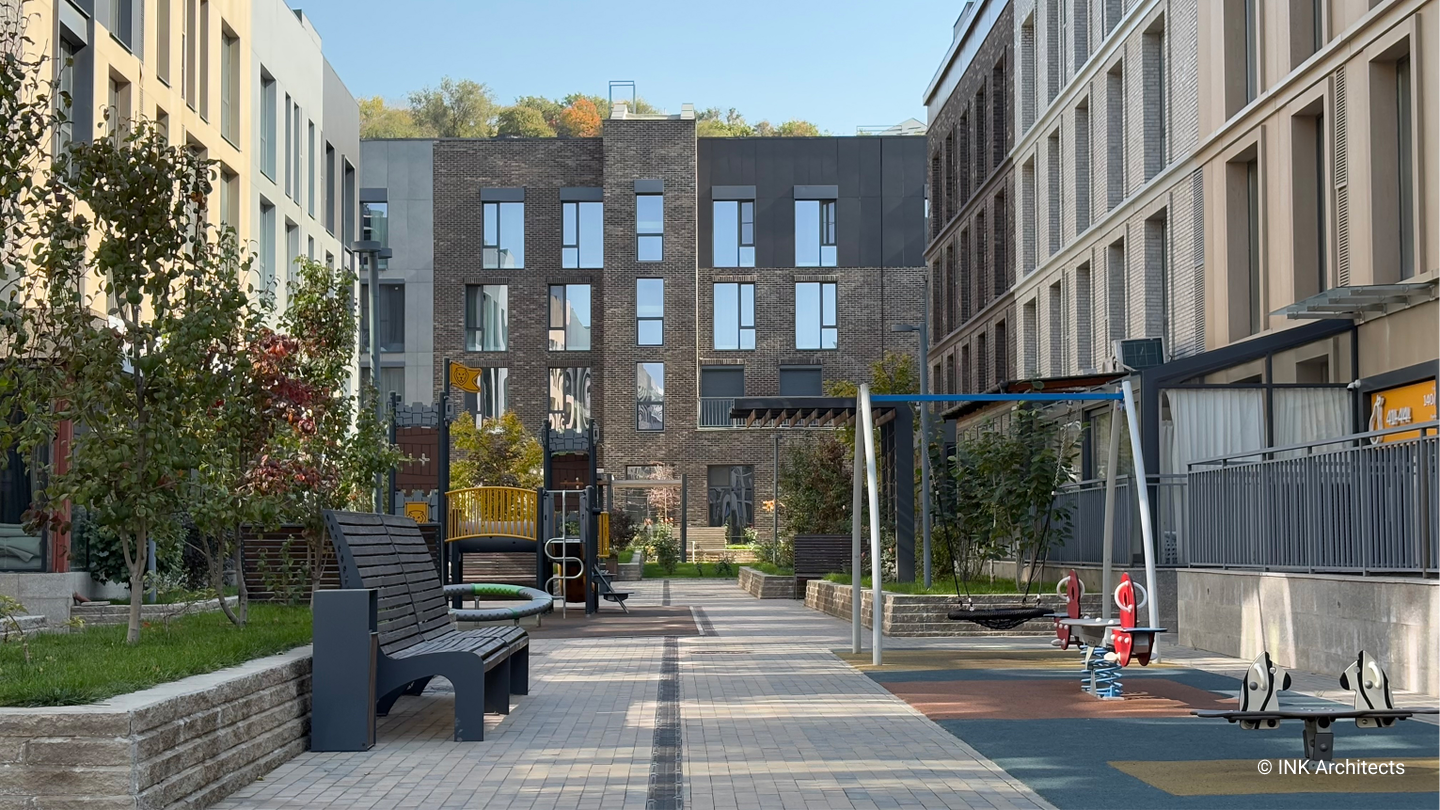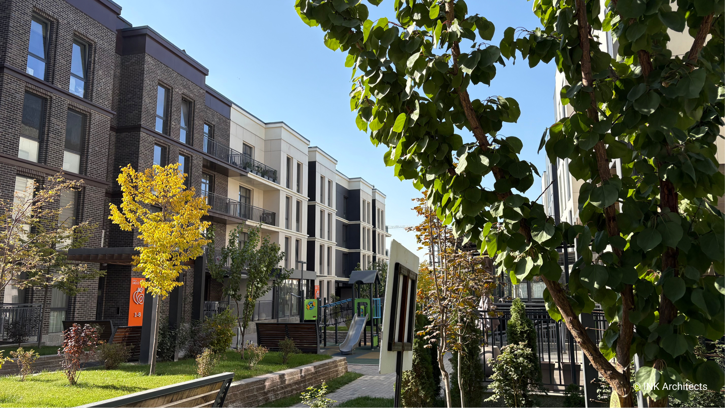 The residents will benefit from 2-4 story buildings, living in a compact and dense neighborhood that boosts the sense of community and overall well-being. The architecture of the complex merges neo-classic and modern architecture styles, featuring facades and building materials that differ from house to house to create visual diversity and a sense of space. The facades' finish incorporates high-quality and eco-friendly modern materials such as natural stone, clinker bricks, ventilated HPL panels, and aluminum facade panels. Vertical landscaping is also provided for creating cozy green courtyard spaces that offer a pleasant environment for the residents.