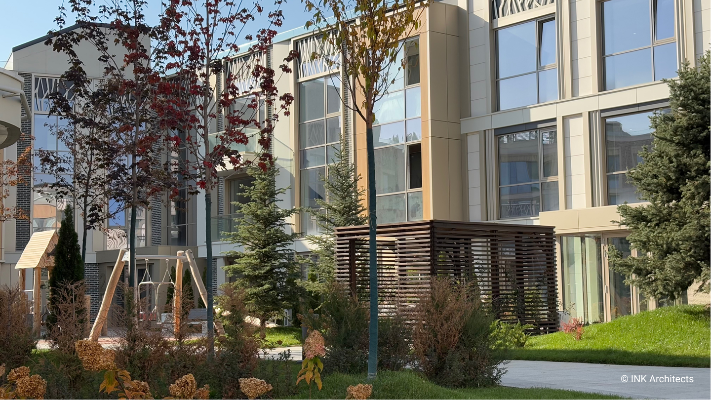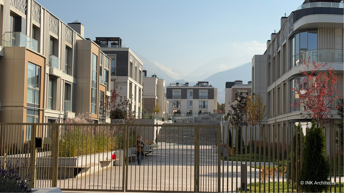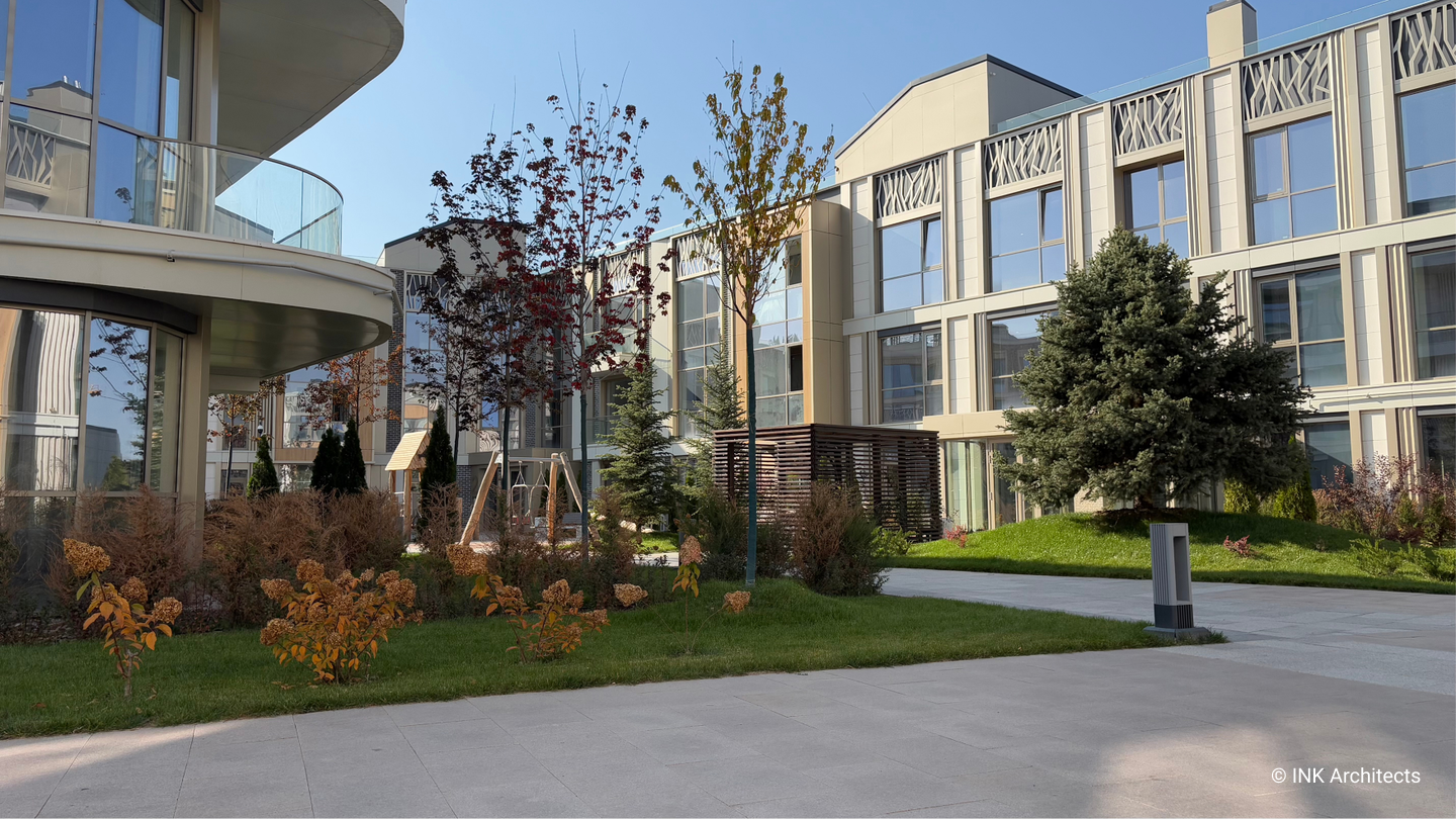The President's Park complex is located in a very picturesque place: next to the First President's Park and Zhailau Golf Club. This is one of the major recreational areas of the city, so it was important to preserve the atmosphere of comfort of the recreation area and at the same time create a self-sufficient cozy urbanized environment.