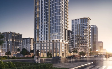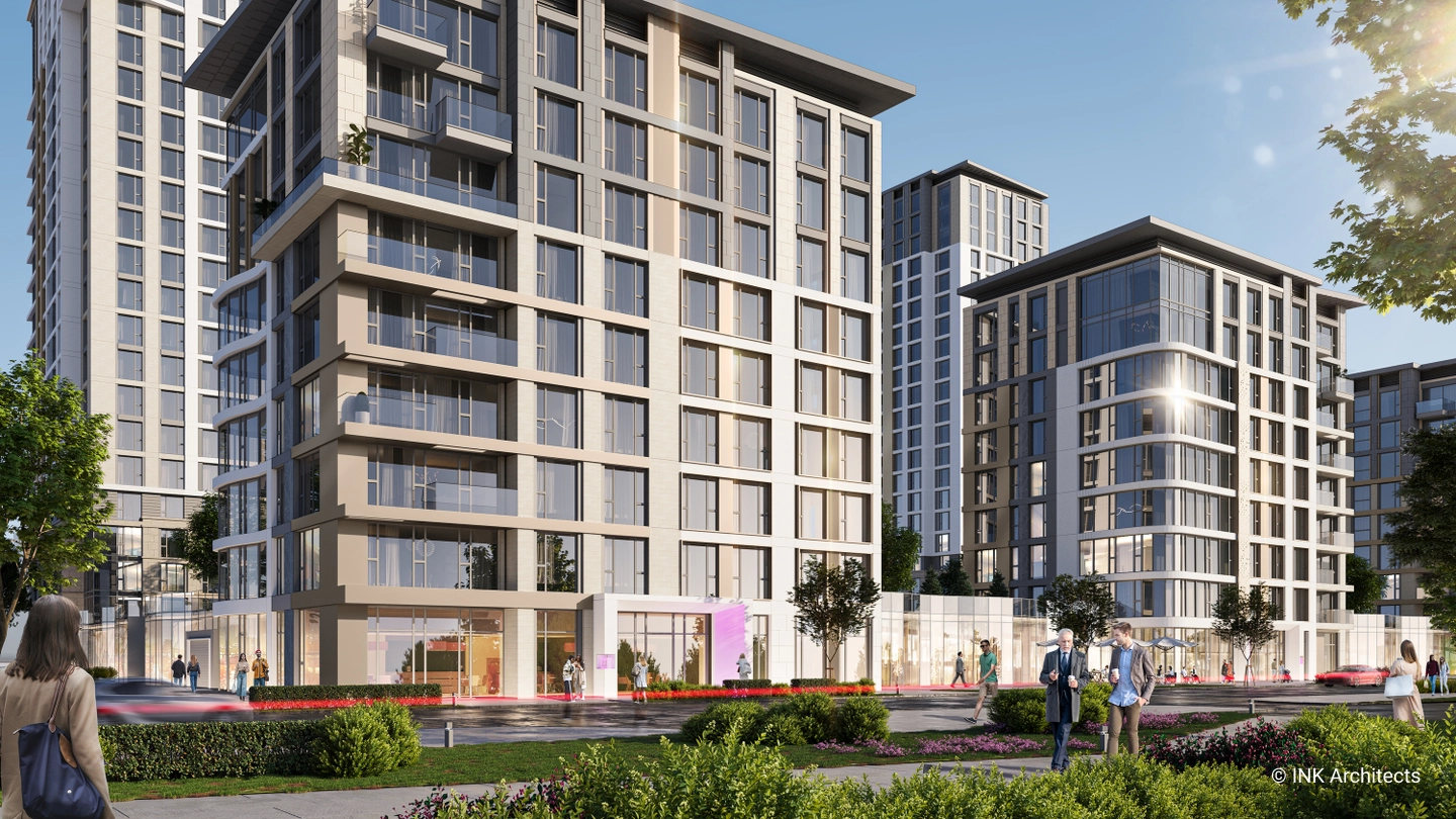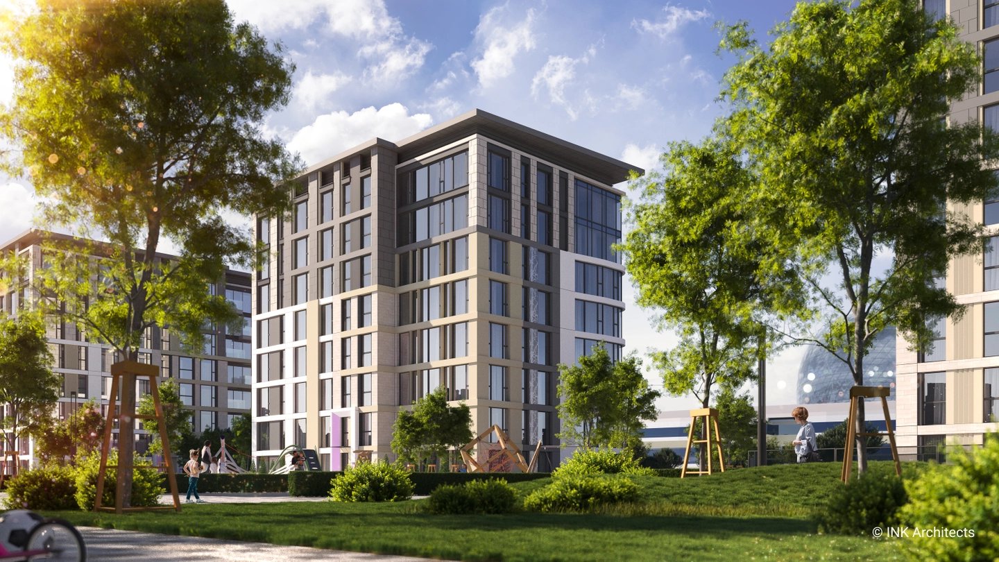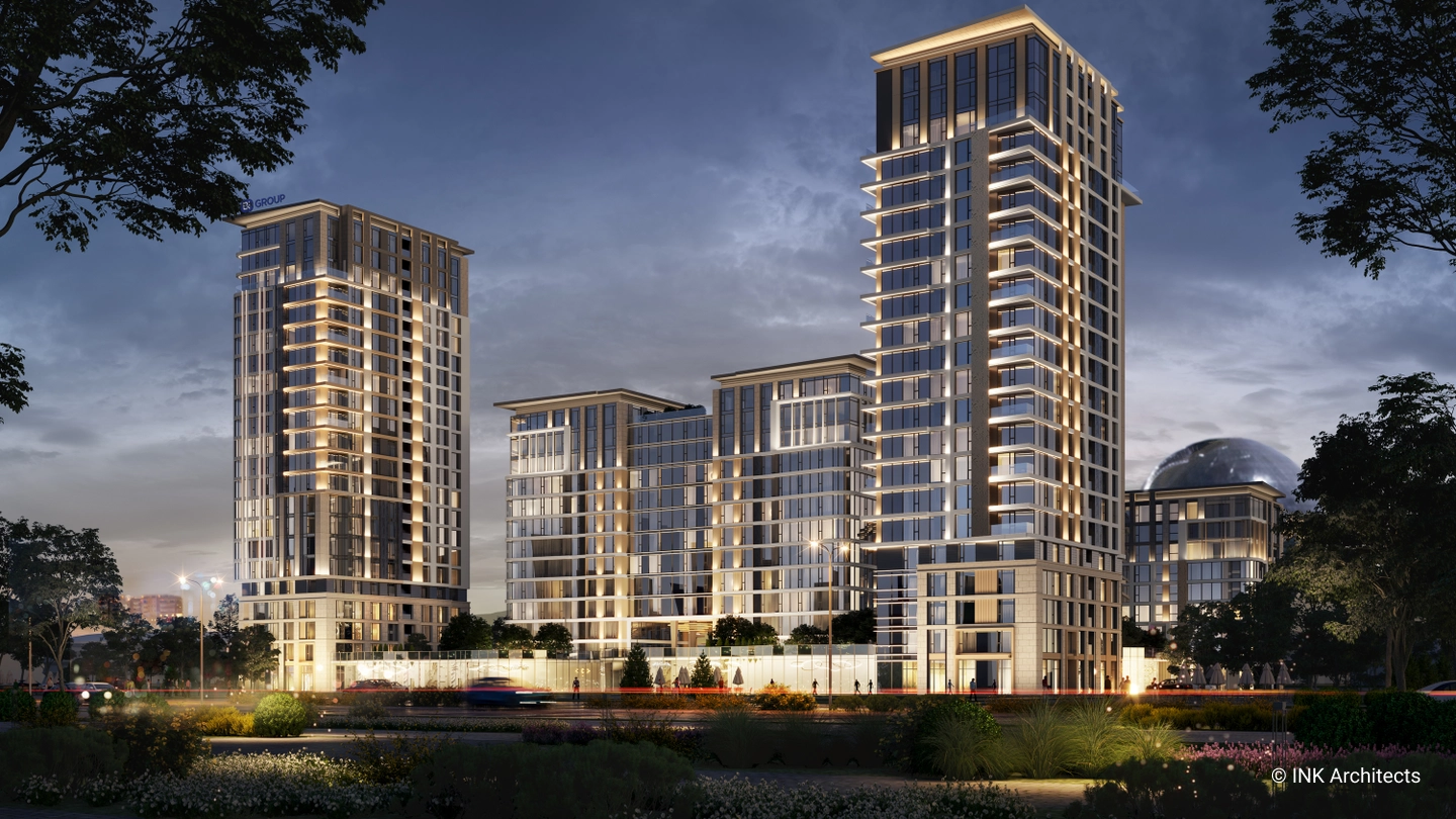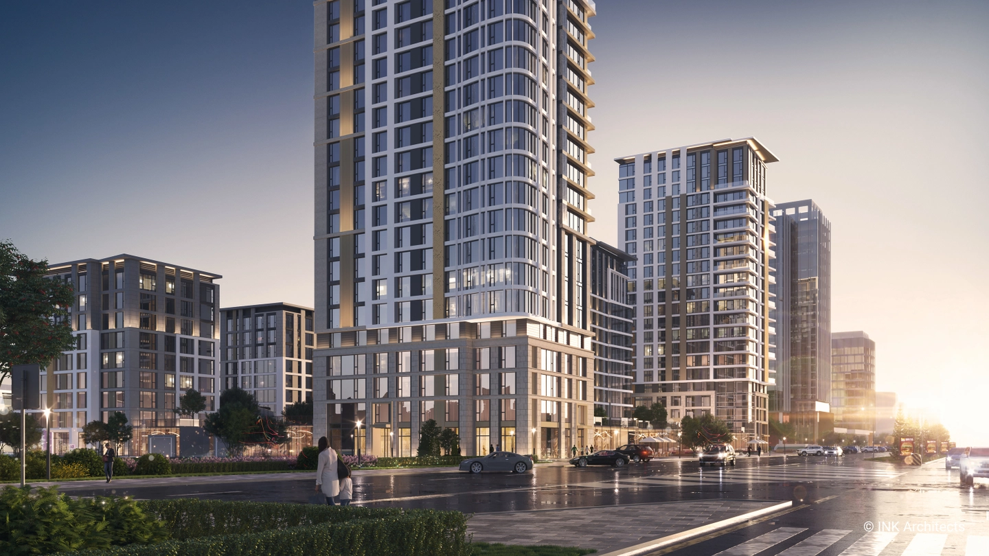 The architectural ensemble consists of seven residential blocks of varying heights—9, 13, and 22 stories—creating a dynamic and expressive skyline. The buildings feature monolithic reinforced concrete frames with modern ventilated facades and stained-glass systems. Special attention has been given to resident comfort, with high ceilings of 3 meters on standard residential floors and 3.3 meters on the upper floors.