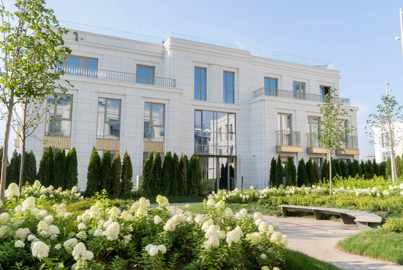 The complex's internal territory is thoughtfully designed for recreation and leisure. More than half of the plot is dedicated to green spaces, with a total landscaping area of 10,996.1 m². The project includes extensive amenities such as children's playgrounds, sports areas, and dedicated recreation zones for residents.