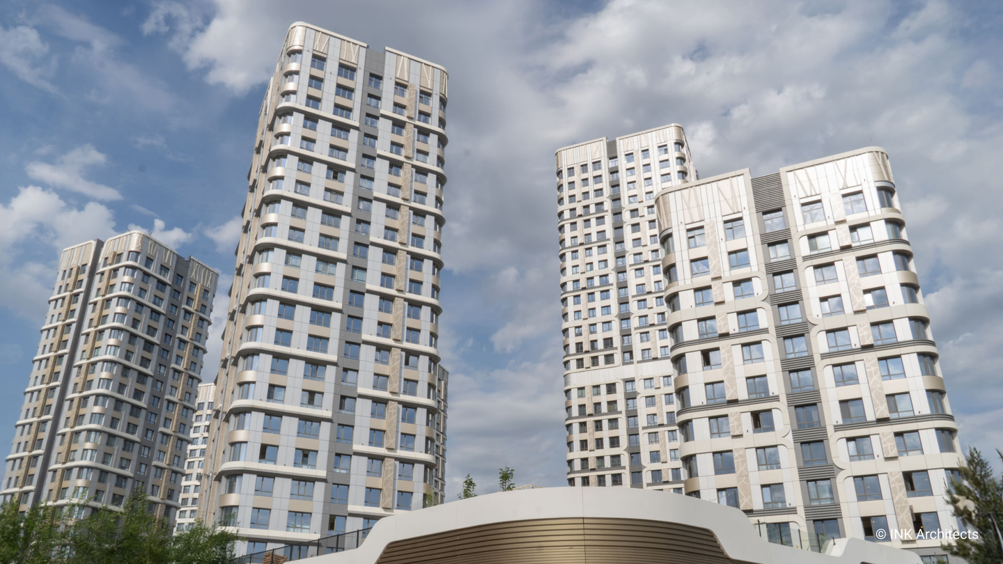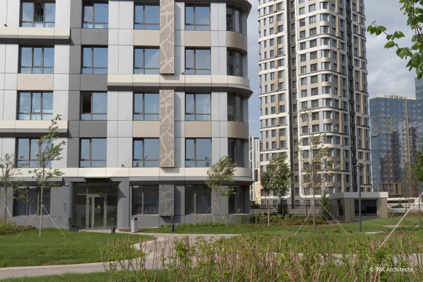 The grandeur of the architectural expression of the complex is entirely in line with creating comfortable living conditions for all its inhabitants. The company's architects have carefully designed the building program and layout for all residential and non-residential spaces. The convenient form of apartments, built-in parking lots, and commercial objects, are accompanied by landscaped courtyards and good district infrastructure. The territory allows its inhabitants to be included in the vibrant business atmosphere of the environment while still providing private zones for rest.