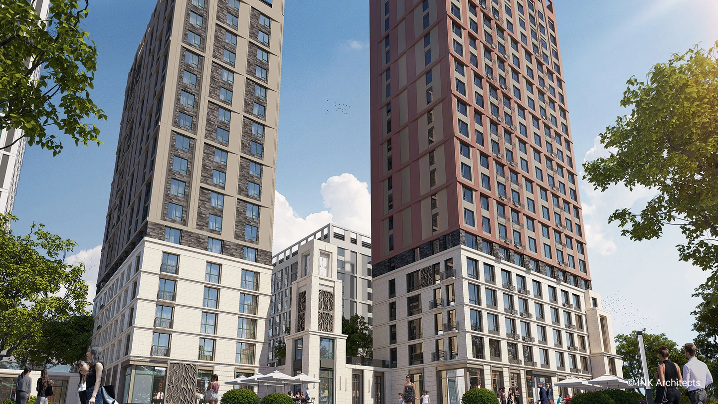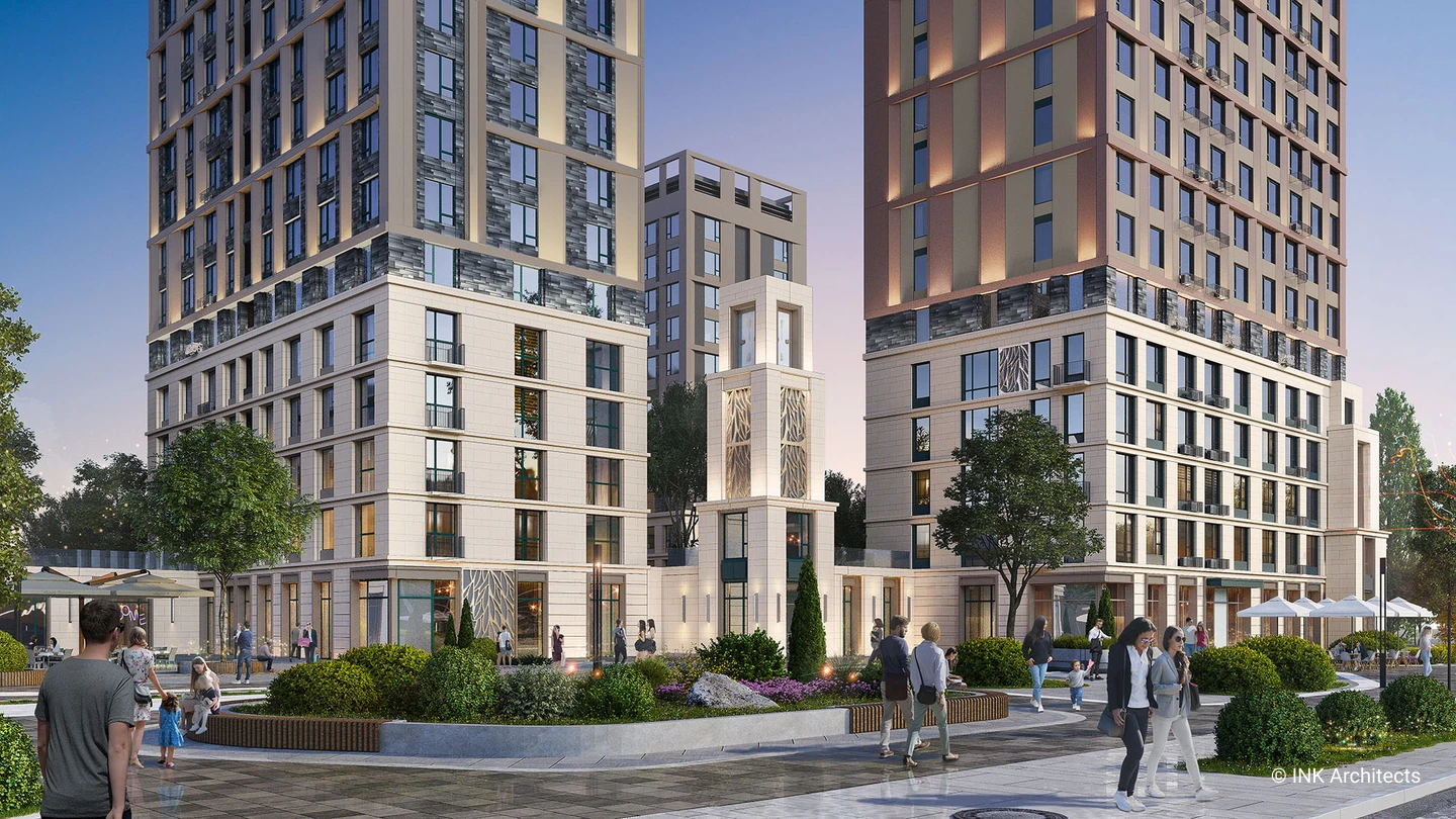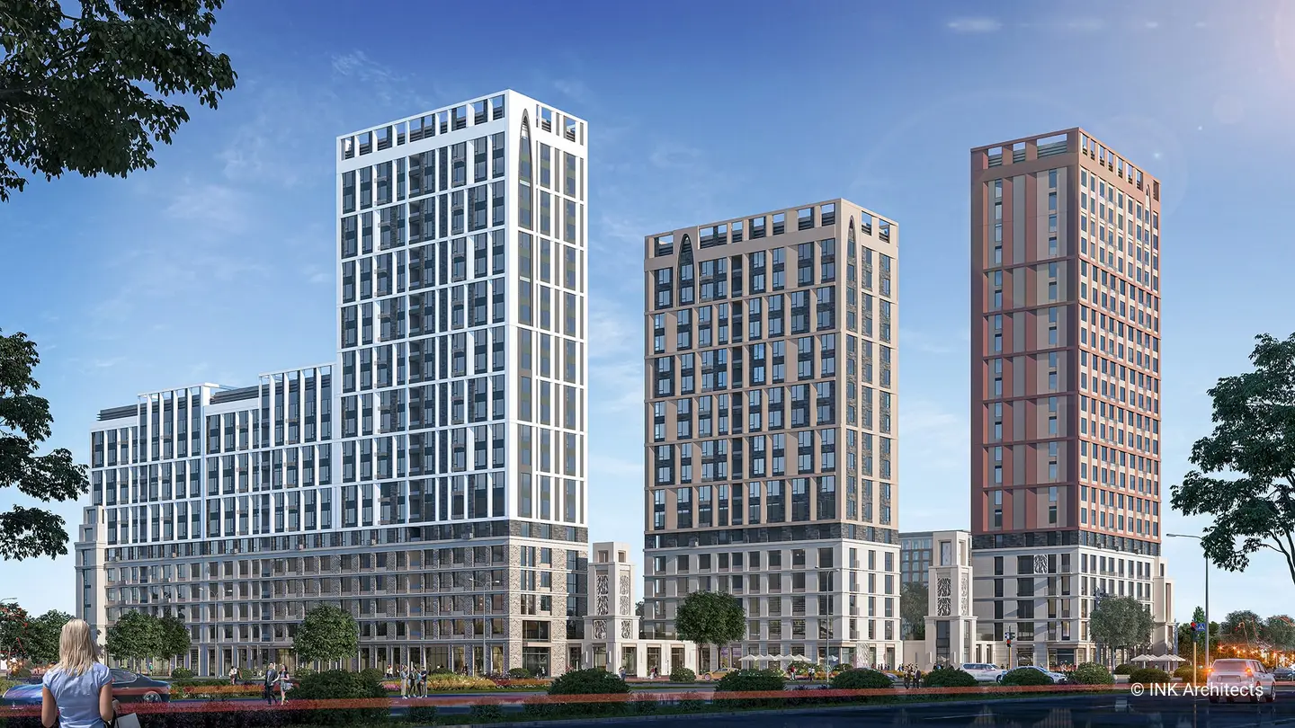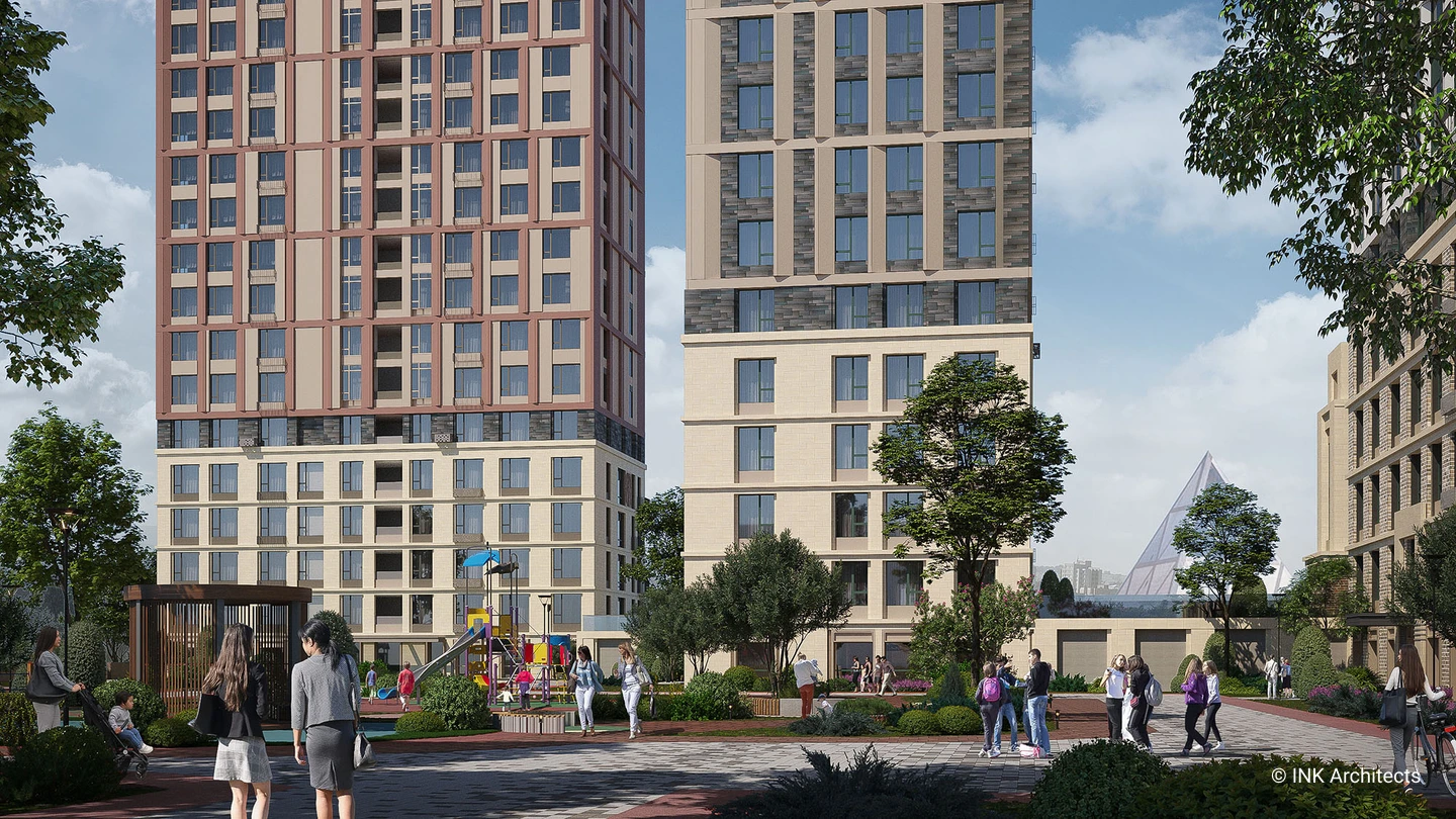 The location of the residential complex build by Sensata Plaza is one of its main advantages, it is located away from busy highways and surrounded on all sides by quiet streets and courtyards. The main facade of the building faces a spacious green alley connecting the triumphal arch and a huge park with a botanical garden and water bodies, which makes the location of the residential complex comfortable and favorable for quiet family life.