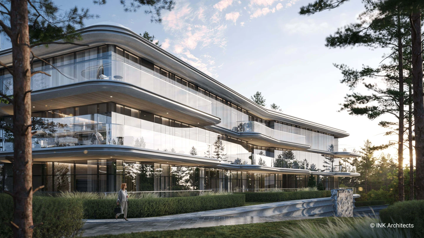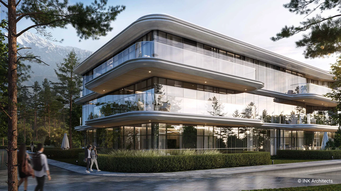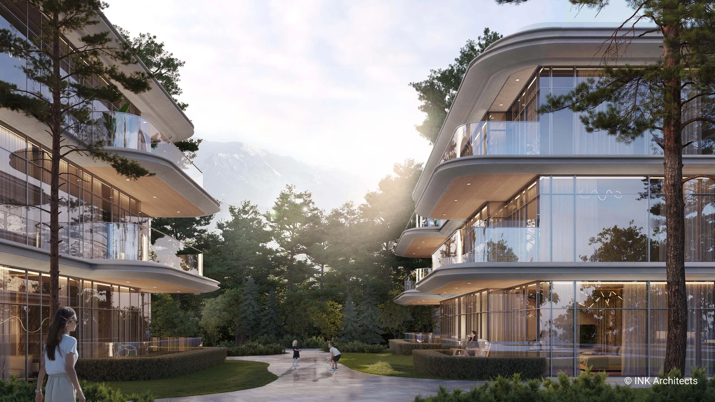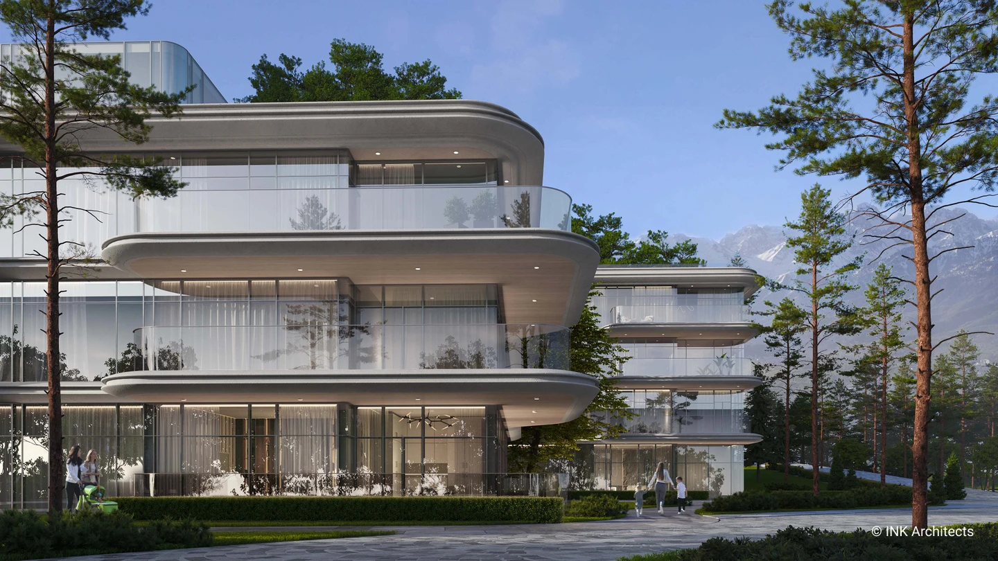 The futuristic design of the Täñir residential complex, whose name translates from Turkic as "the highest divine power connected to the sky," is distinguished by its harmonious fusion with the natural landscape of the Zailiysky Alatau.