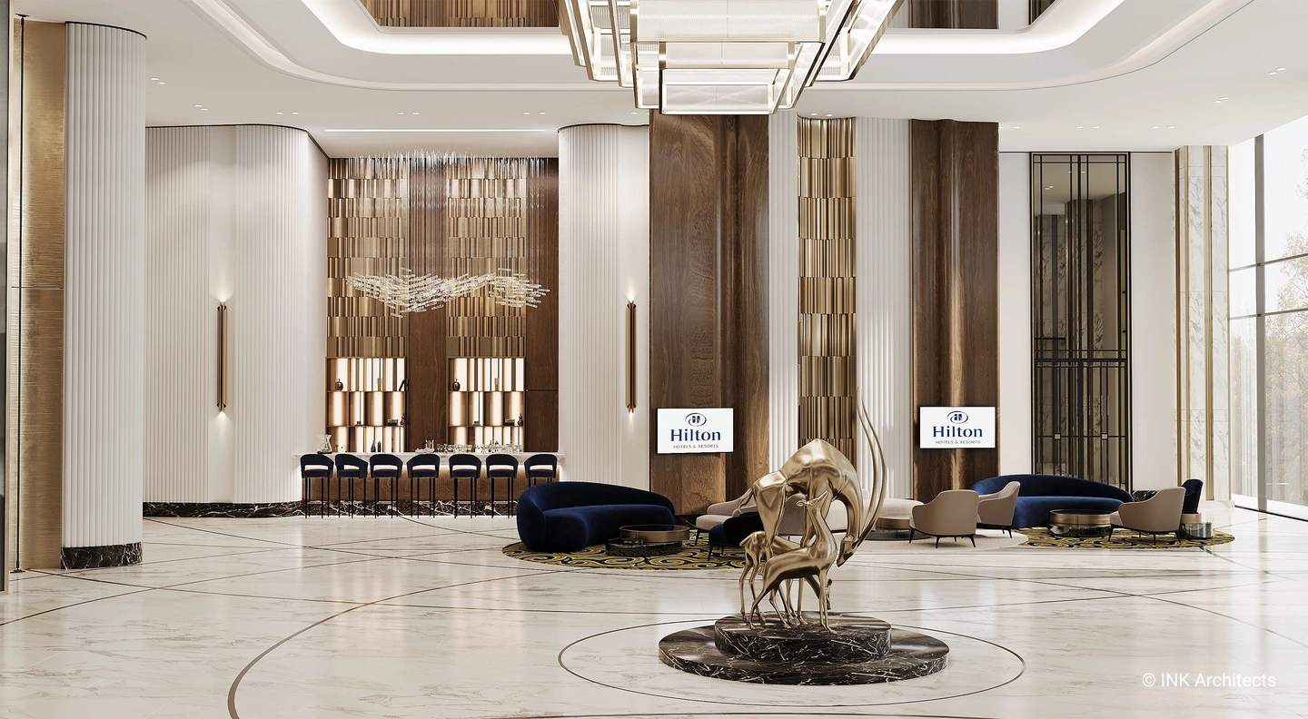 The Hilton Shymkent project exemplifies our capability to craft layered, functional, and aesthetically compelling public interiors. We pride ourselves on delivering unique guest experiences grounded in local character while upholding world-class hospitality standards. At INK Architect, we design spaces that tell compelling stories and create lasting value.