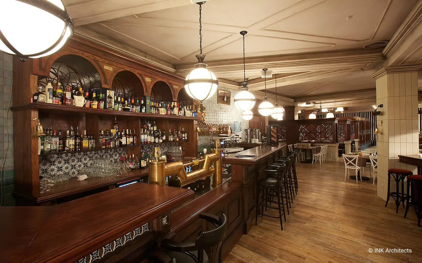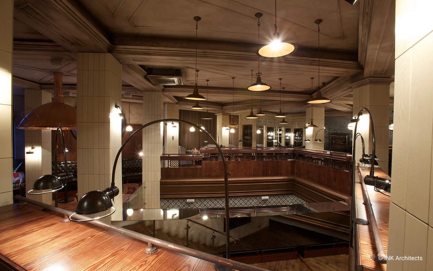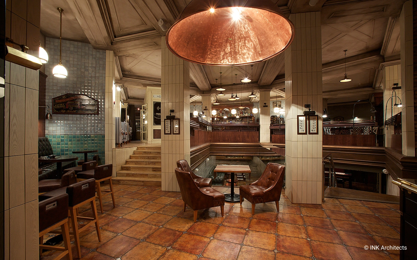 The wordplay, as in the establishment’s name and primal function, substantiates the project’s conceptual framework. A playful mood is reflected in the layout structure and in details of décor: transitions from classical to neutral, simplified, "democratic" forms.
