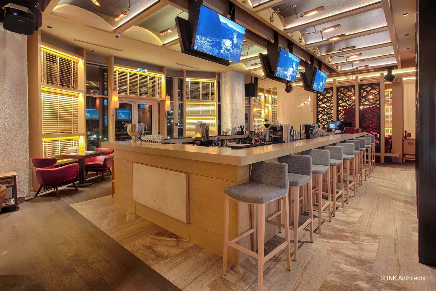 A café-bar located in the business district surrounded by the business complex Nurly Tau.