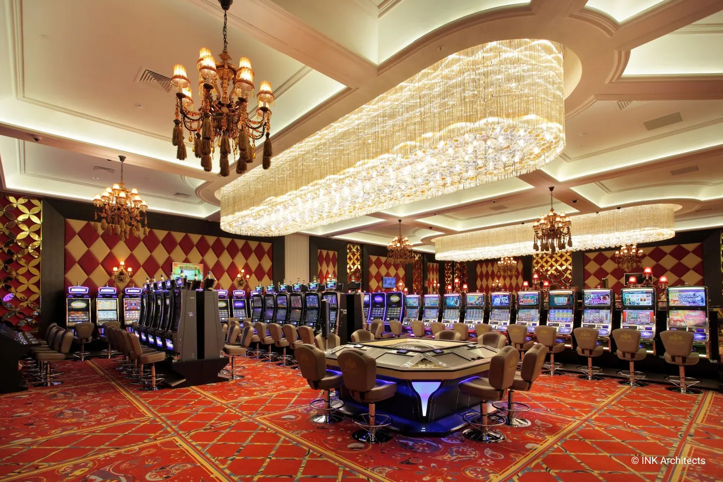 Contoured backlit shapes underscore the bright, flamboyant space, imparting even greater polish to the casino’s architecture and interior design, a detail characteristic of the world of entertainment.