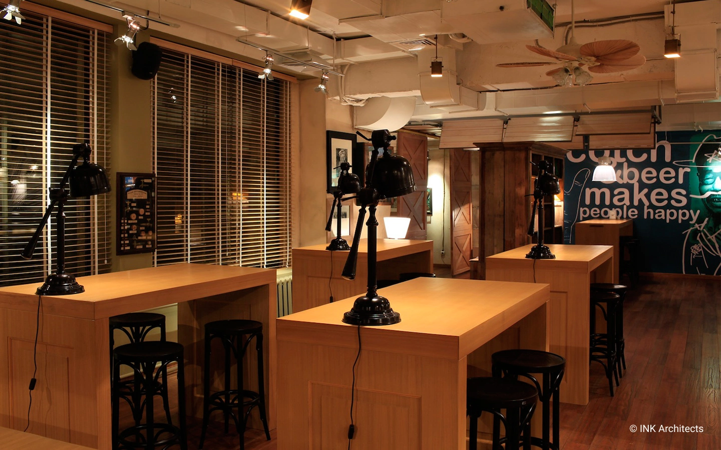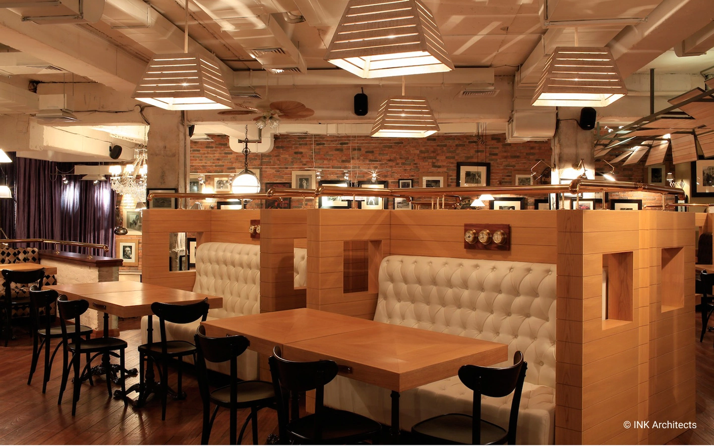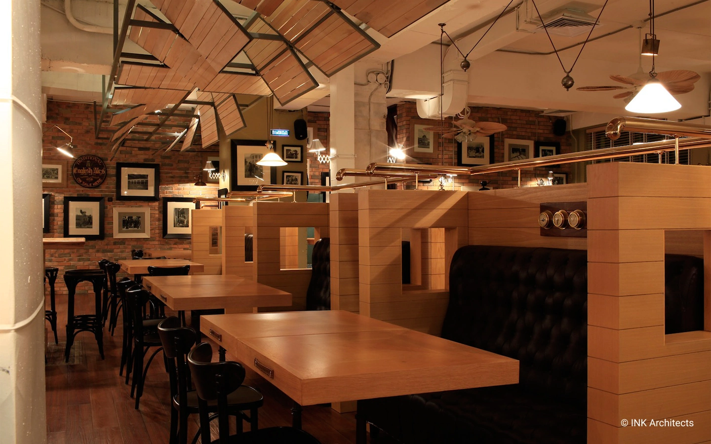 The design features and capabilities of the existing premises were used. Concrete was preserved in large part on the ceiling and columns. Originality in resolution – wooden panels suspended from certain areas of the ceiling serve the function of a kind of fan.