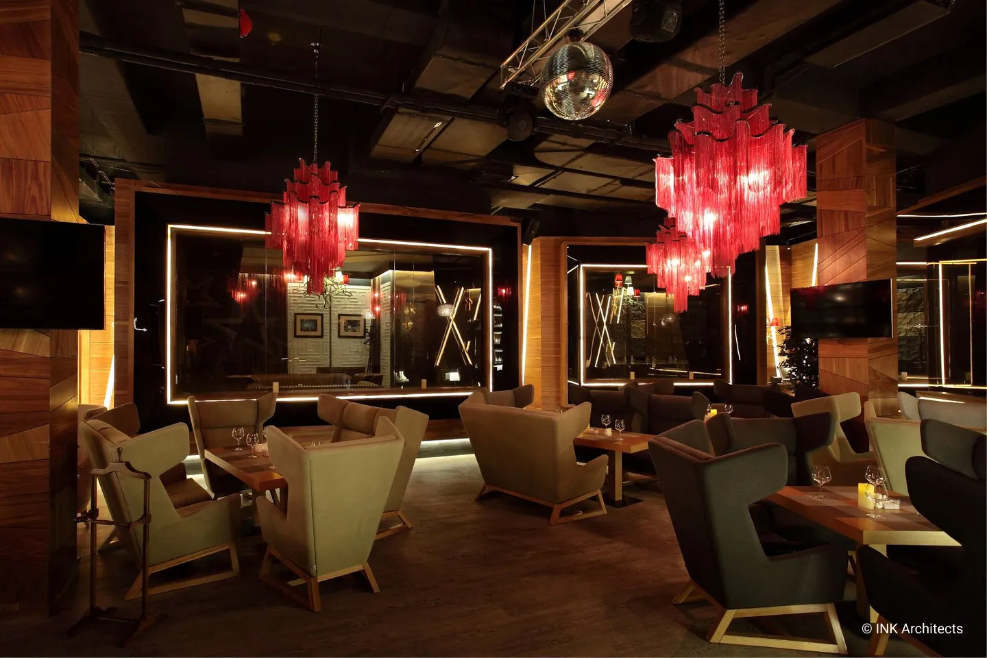 A world of illusion – a modern virtual realm in which we spend a large portion of our time. It is reflected in the choice of the project’s conceptual framework. The interior is presented as a television space: the huge, dark, transparent screens of TV boxes (VIP-cabins) come through into the central hall and form the dominant compositional element.