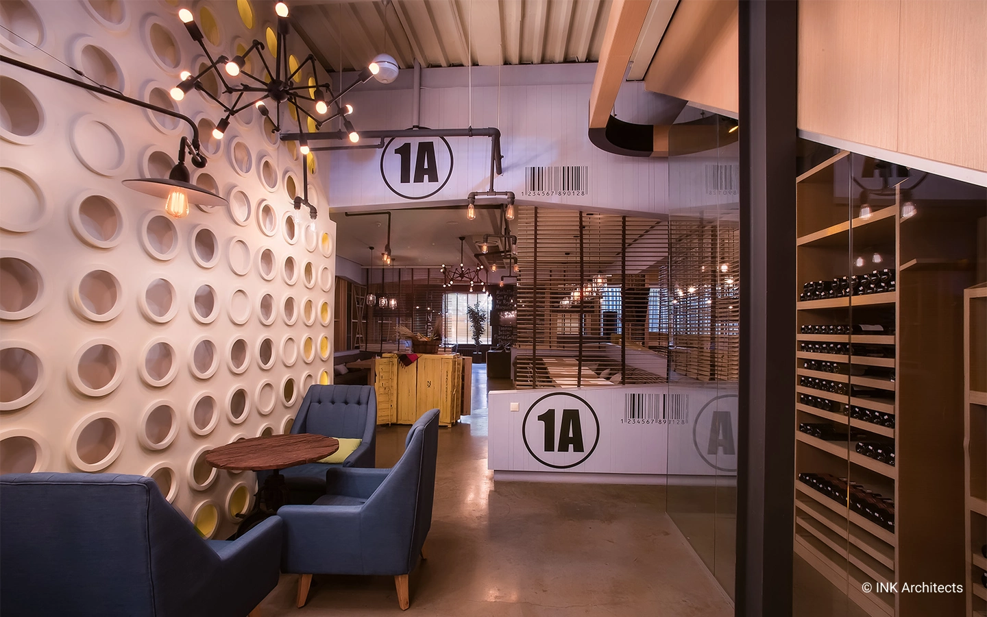 The restaurant's interior is filled with a variety of spatial partitions made in wood with decorative metal grilles and gypsum board panels with decorative cutouts. The interior features a restrained range of colors and a careful selection of lighting fixtures and soft furnishings.