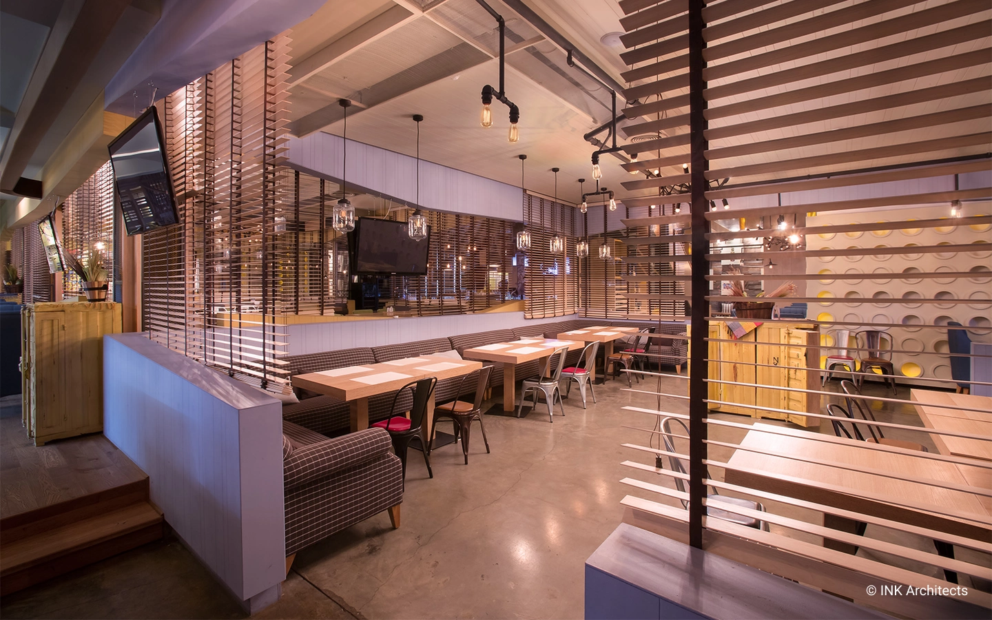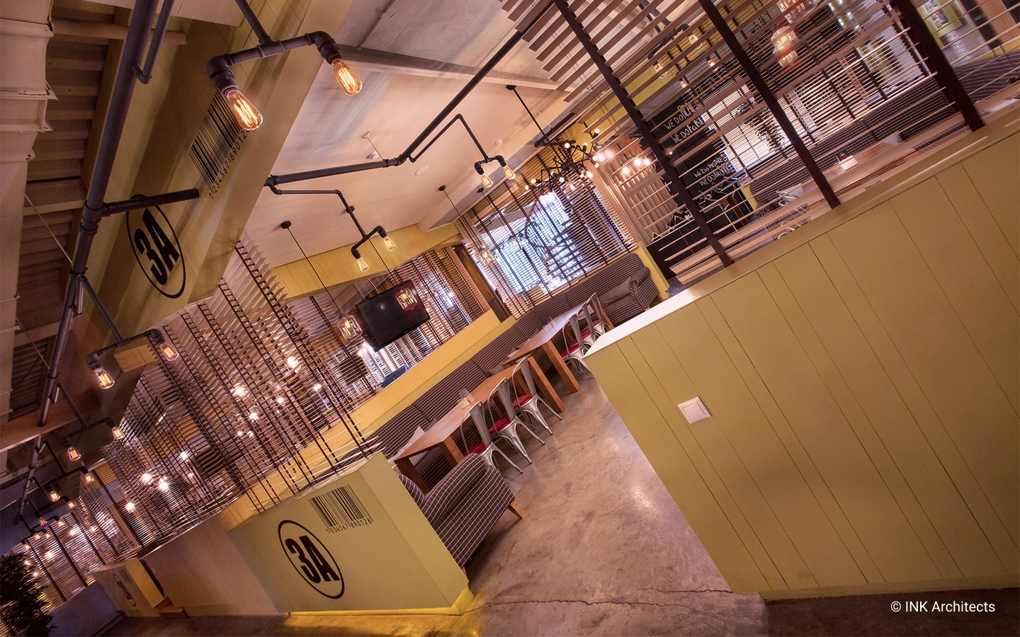 The project features many original solutions to important functional tasks. These include a suspended decorative beam possessing utilitarian functions that hangs under the ceiling and twists in space throughout the entire restaurant. The beam provides the space with hanging light fixtures, unusual props, and televisions.