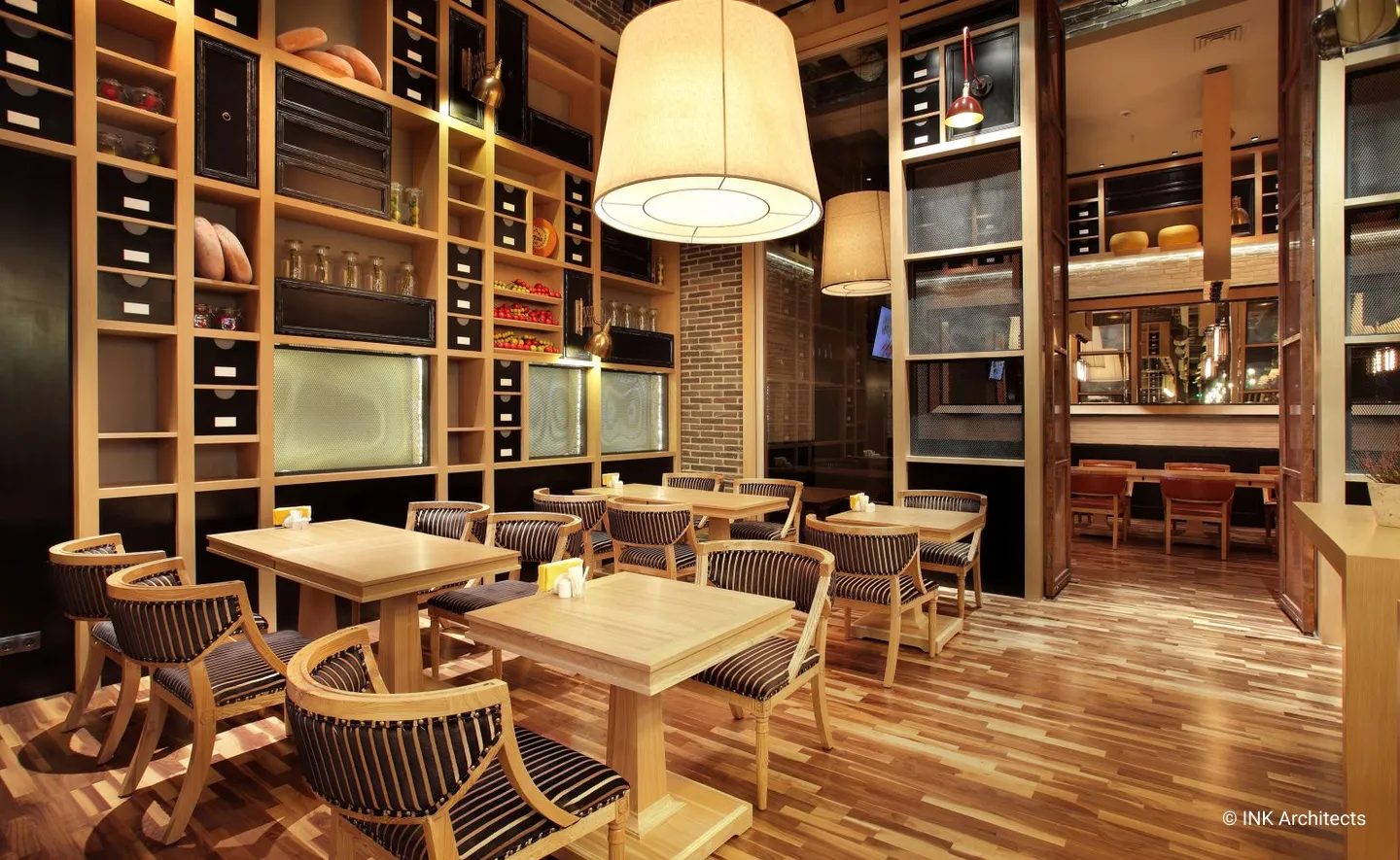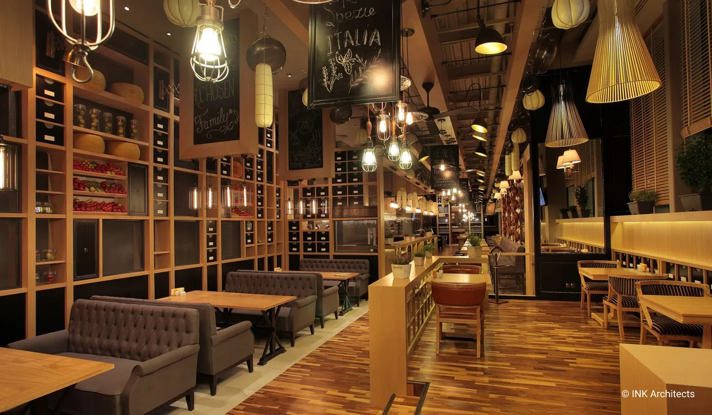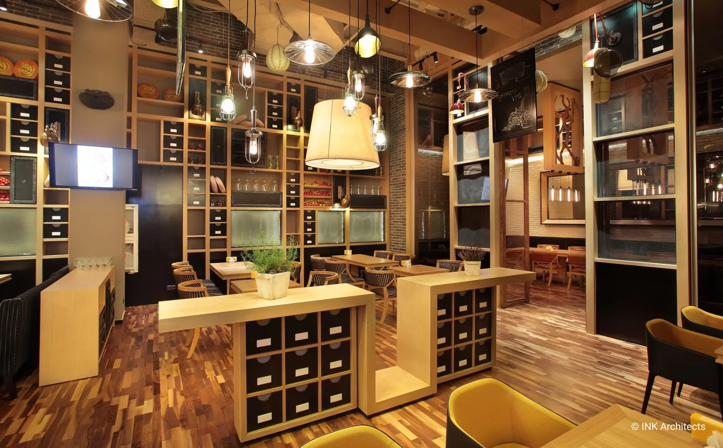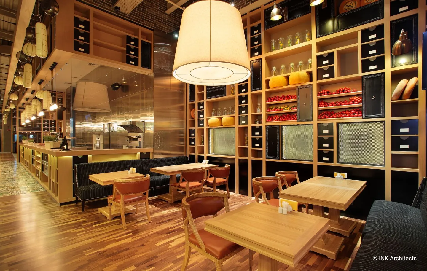 In order to reduce the height of the room without compromising its overall lightness, three wooden planks - "balance beams" - were laid across the ceiling. These beams feature fans, lamps, and decorative elements including hanging menus, plates, spoons, ladles, and edible products, like cheese. The same composition is found on the wall where copper kitchen items act as ornaments. The center of the space boasts a kitchen and pizza shop.