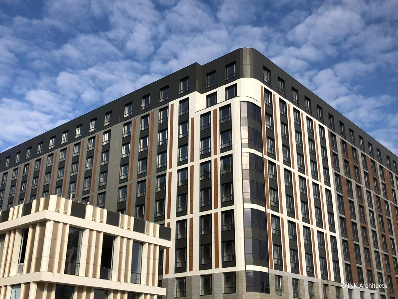 The design concept of Apple City is about simplicity, elegance and colour contrast. INK Architects invested time to tailor the facade’s aesthetics influenced by modern architectural style, the canons of classical proportions and a play of simple materials. The contrast of rough bricks, smooth stones and minimalistic metal panels gives a rich but at the same time sophisticated and warm exterior.