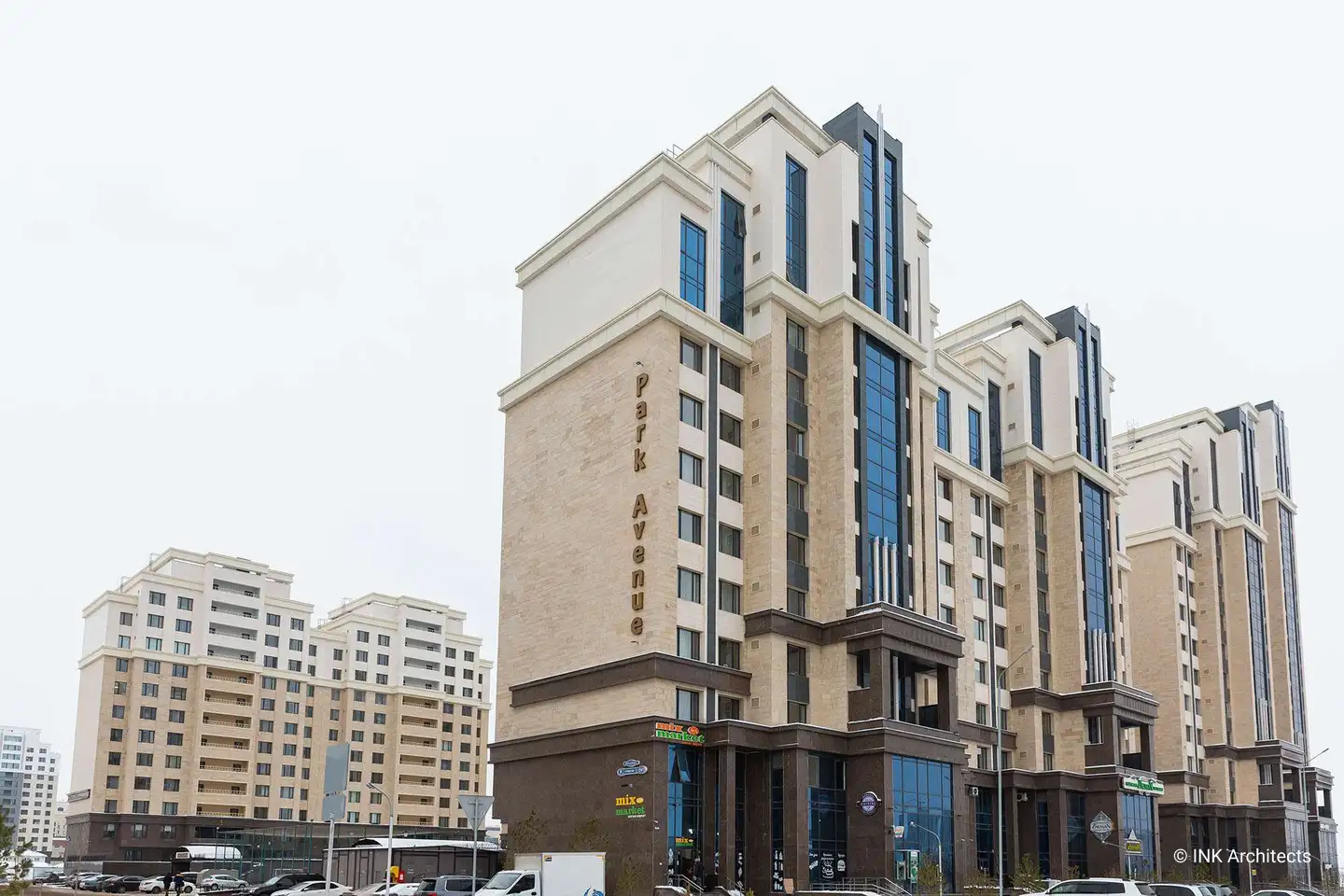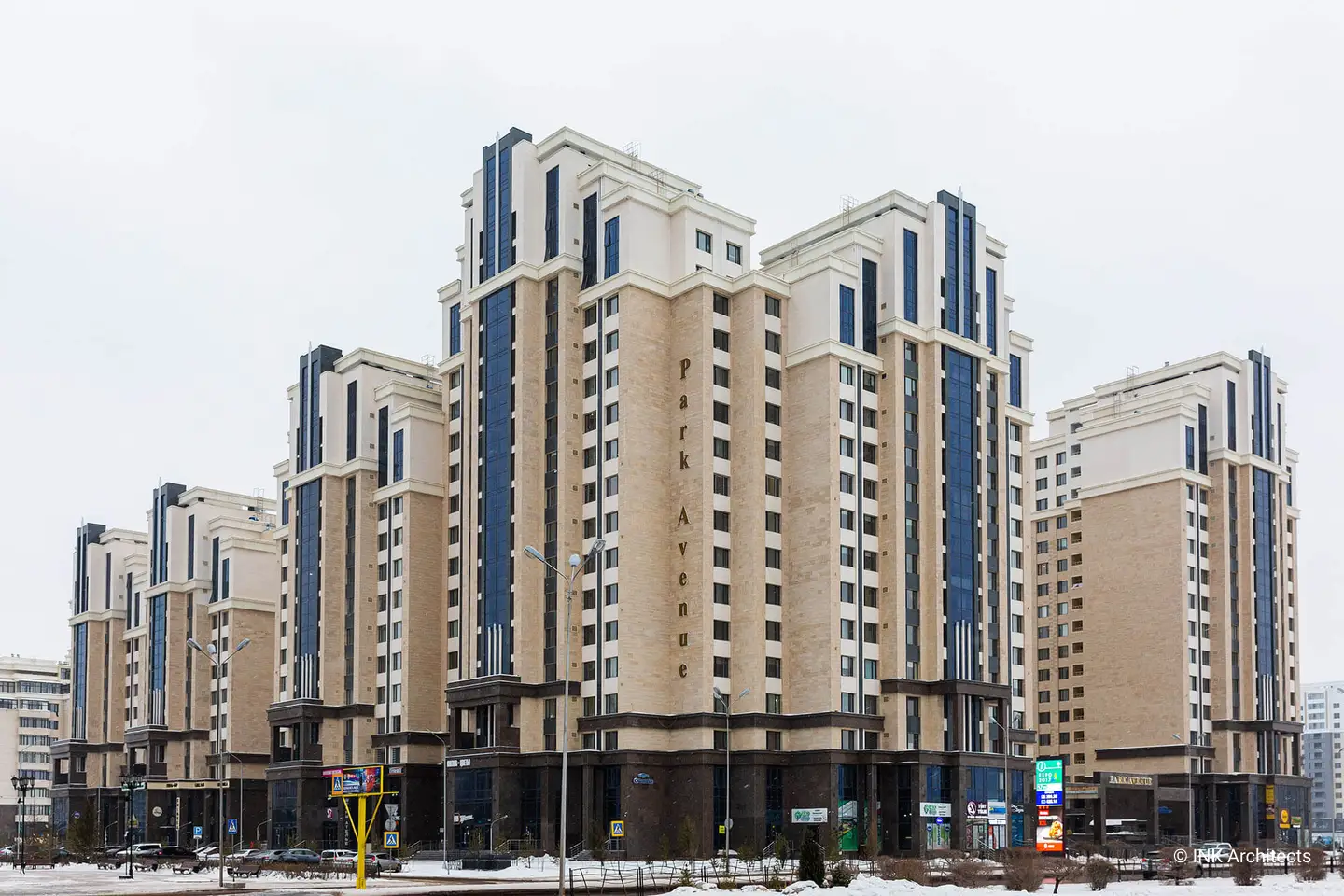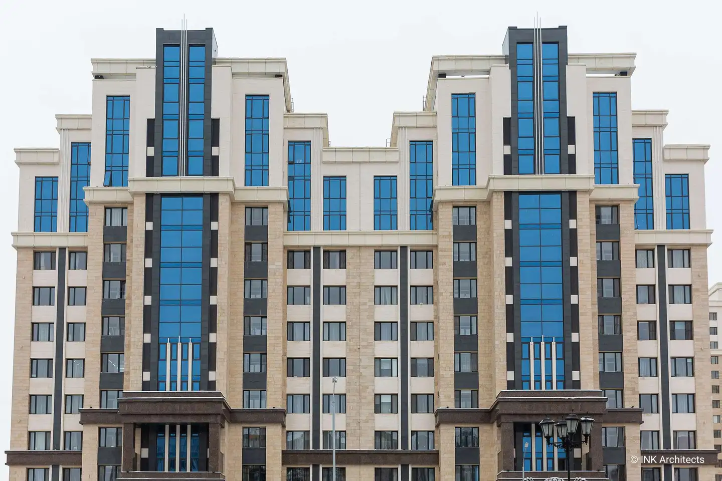 The architecture of this residential complex along Orynbor Street is designed to integrate organically into the spatial surroundings of the city. The aesthetics of the facades feature light-shadow modeling of shapes with the help of the facade partitioning, a pyramidal play of the low overlapping (a modern interpretation of the roof), and the combination of two shades of color. The ground floor, intended for commercial purposes, is a kind of base; the platform for the entire residential structure. It is highlighted and emphasized by the horizontal line of the flooring cornice.