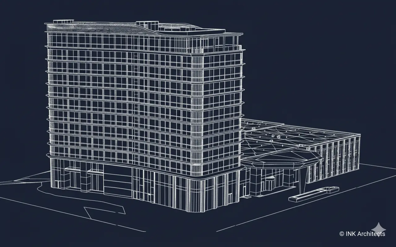 The architectural concept of the building is based on a harmonious blend of aesthetics and functionality, reflecting modern trends in hotel design.