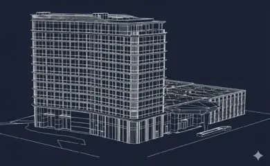 At the bustling intersection of the new Shymcity district stands a modern five-star hotel from the international Hilton chain, seamlessly integrated into the urban landscape.