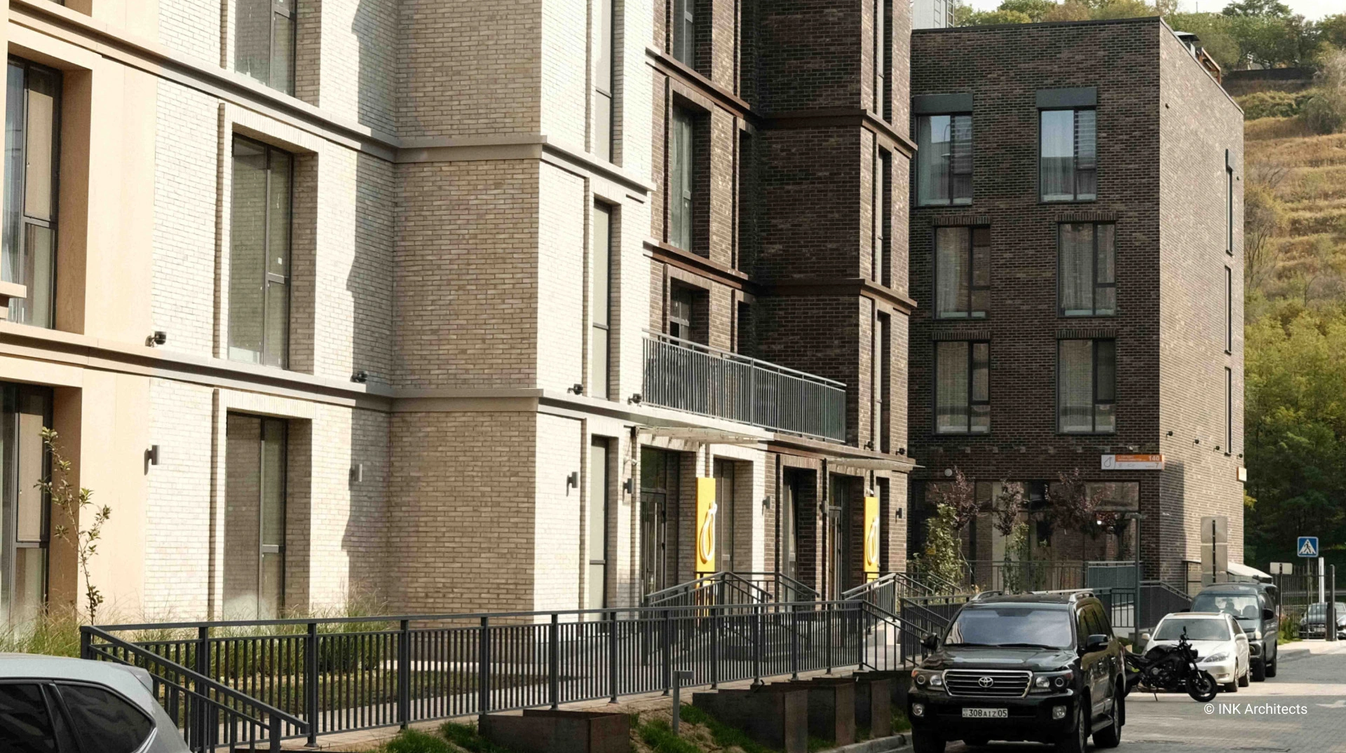 Архитектура комплекса основана на современной интерпретации европейской неоклассики. Фасады выполнены из натурального камня, клинкерного кирпича, HPL-панелей и алюминиевых элементов, что создаёт выразительную фактуру и долговечность. Вертикальное озеленение и множество зелёных зон формируют приватную и уютную среду внутри кварталов.